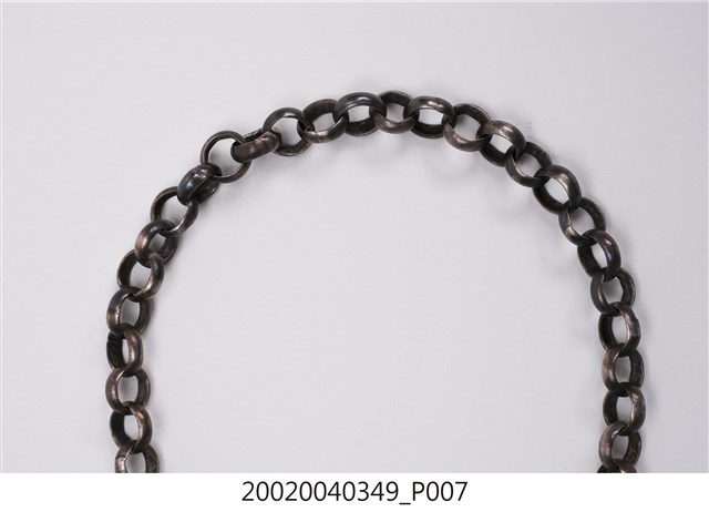 本文物為花籃項鍊,分為項鍊墜及鍊子兩個部件。項鍊墜的部分以花籃主造型,下方垂墜的小綴飾,中間綴飾為關刀造型。鍊子部分為金屬鎖鏈狀,靠近主飾品部分的地方製成藤蔓捲曲狀。臺灣原住民及漢人皆會帶配飾,而就漢人而言女性使用飾品的比率比男性高。傳統社會中女性配戴的首飾,代表家族的財富及地位,尤其在嫁娶之時,以金銀飾品作為聘禮也十分常見。在臺灣貧者在嫁娶至少要有銀簪,而富者並無限制。因此,飾品不但反映當時社會的審美觀,也是女性及其背後家族之社會地位之象徵。