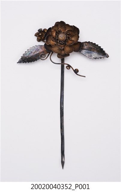 本文物為金屬牡丹花髮簪,上方正面為牡丹花盛開及綠葉之裝飾,背面為無裝飾,裝飾部件下方為可插入頭髮的一股細長金屬。臺灣原住民及漢人皆會帶配飾,而就漢人而言女性使用飾品的比率比男性高。傳統社會中女性配戴的首飾,代表家族的財富及地位,尤其在嫁娶之時,以金銀飾品作為聘禮也十分常見。在臺灣貧者在嫁娶至少要有銀簪,而富者並無限制。因此,飾品不但反映當時社會的審美觀,也是女性及其背後家族之社會地位之象徵。
