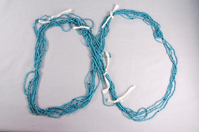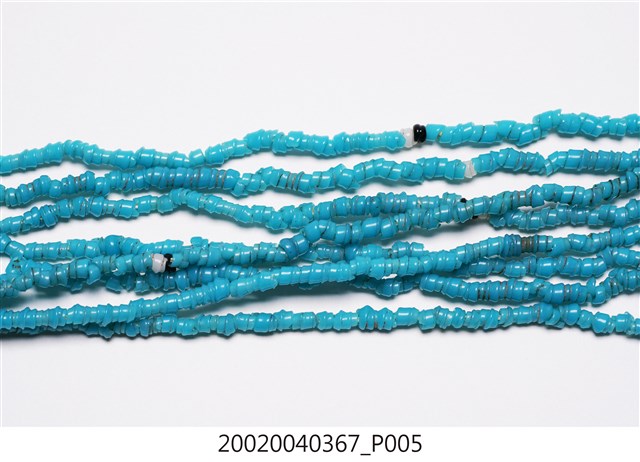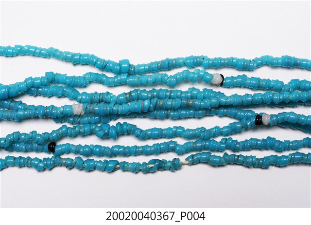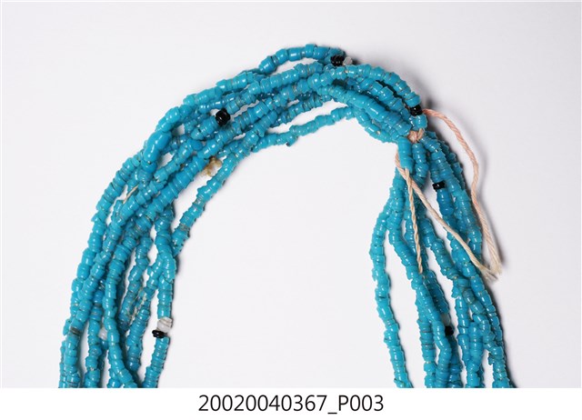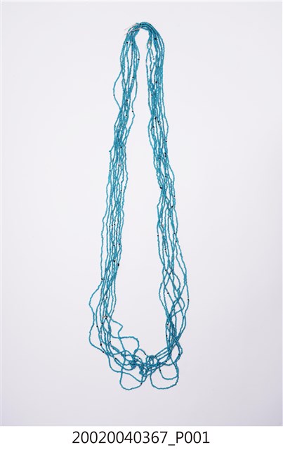本文物為串珠鍊,鍊子以藍色串珠為主,並穿插白色、黑色串珠在其中。臺灣原住民及漢人皆會帶配飾,其不但反映當時社會的審美觀,也是女性及其背後家族之社會地位之象徵。