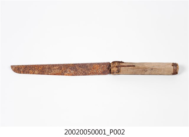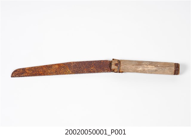 本文物為手鋸,是木工的工具,為1960年代以後臺灣的工具店發展出來的鋸子種類,非臺灣傳統鋸。鋸是木工司傅用以切割木料的工具,以金屬鋸條和握柄組成,本件鋸條是單面鐵製鋸齒,一端插入木製長條握柄中,以平頭鐵釘固定兩者。刃長27公分,為9寸鋸。本件鋸由使用者自行修理,握柄兩端以鐵線加固。以鋸齒的形狀與排列不同,可用以橫斷或縱斷木料,分為橫斷鋸或縱斷鋸,本件為橫斷鋸。