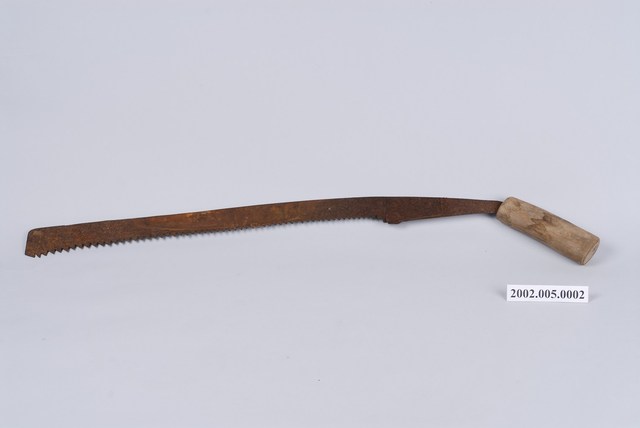 本文物為手鋸,是伐木或山林工作的工具。本件手鋸鋸齒成凹弧形,又稱彎鋸,適合切割圓形的樹幹、粗樹枝,多用於伐木或山林農業。本件手鋸以鐵鋸片和木握柄組成,鋸片後端朝下斜插入木握柄中。鋸刃長42公分。此種形式的鋸子在日本時代從日本引入,早期用於伐木事業,為伐木工隨身攜帶手鋸,可清理環境、鋸直徑較小的樹木製作木架等。本件手鋸的鋸片後端有以兩片鐵片夾住,以鉚釘焊接,為使用後修補時增加,非原鋸片作法。其修補鉚釘為日本時代即引入作法。