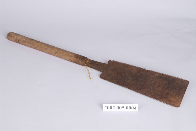 本文物為雙面鋸,是木作司傅使用的工具,又稱日本鋸,為日本時代引入的木作工具。雙面鋸的特色是鋸片兩側皆有鋸齒,後端插入木質長條握柄固定。兩側的鋸齒功能不同,細齒用以橫斷木料,粗齒用以縱切木料。本件鋸刃長24公分。握柄一面施紅色油漆,可能為製造者或使用者所施。雙面鋸為推鋸,是日式鋸的作法,即主要施力於往前推出時,拉回時則輕拉。