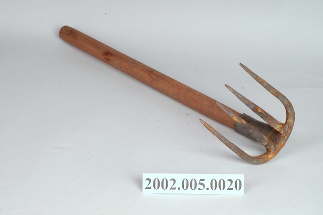 本文物為釘耙,耙有四齒,故稱四齒耙,或四齒。本件四齒耙為短柄,尖齒,為傳統農具及現代園藝用具,因其尺寸較小,適合小面積菜園或花園的除草、鬆土。本件鐵杷後端作成圓筒形箍以置木柄。白鐵材質則為1980年代以後材料。在金門又稱狗耙仔,因其通常用以收集狗屎作為肥料之用,亦用來挖小地瓜、收集花生等。亦用於營造業耙集碎石,或鐵路工人整理鐵軌碎石等。