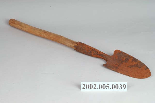 本文物為尖鏟,是鏟的一種,前端尖角形,因 此名之。尖鏟鏟面彎曲,為戰後由美國傳入的園藝工具,是鬆土、挖洞、小規模搬動土的農具。長尖鏟更利於小面積內挖深洞,因此多用於坡地林間。本件鐵鏟後端收為圓筒形箍以套入木柄,箍後端並作成齒形,箍上釘入鐵釘加固,為戰後作法。
