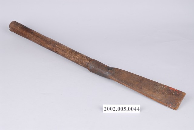 本文物為土鑿,是挖土洞的農具。本件土鑿鑿頭為窄長的扁刀片,前端刀口為平口刃。刀後端收為圓筒形箍以套入木柄,為傳統漢式農具作法。窄長的鑿刀頭便於深入土中,刀頭伸出時將土帶出,成為深洞,刀刃則可切除草根。日本時代種植黃麻時使用此種土鑿挖洞,也稱黃麻鑿。挖洞完成後大小大約可插入一根甘蔗等插植類作物,或是立瓜棚時可插入瓜棚柱。挖小池時亦可使用此工具挖土、移土。