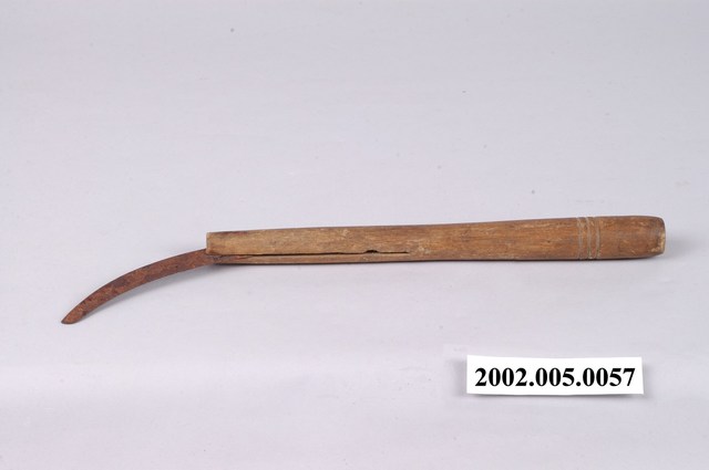 本文物為割稻刀,為鐮刀的一種,因主要用來割稻,名為割稻刀。鐮刀主要為收穫用農具,也在山林活動使用。用途主要為割草、割稻麥、藤蔓等。鐮刀基本形式為彎月形鐵片,內緣為刀刃,割稻刀的刀片為細長形,刀刃改為鋸齒,為1970年代以後發展出的鐮刀形式,在割稻上取代了傳統的鐮刀。割稻刀的刀片後端插入木柄凹槽中,木柄頂端以鐵釘加強固定。本件木柄為工廠機械生產製品。
