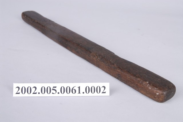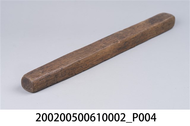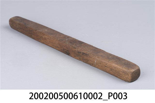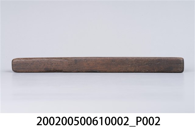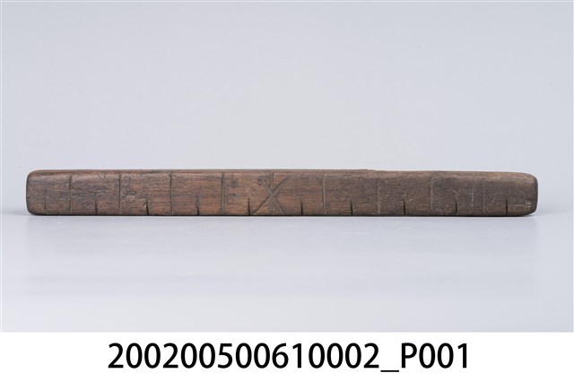 本文物為木尺組的一件。本件木尺是裁縫或布業使用的尺,用以製作服裝、裁剪布料時量度長度。以切成角形的木條製成,長度為日制一尺,公制30.3公分,正面以直線完全橫過尺面的刻痕分為十格,每格表示日制一寸,公制為3.03公分。僅橫切一半的刻痕為半寸。並於中央半尺處以交叉斜刻文標示。臺灣採用日制為日本時代1906年實施日本的尺貫法以後,至今仍然通行,通稱該次公布的尺度為臺尺。