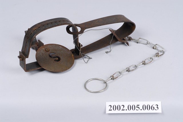 本物件為夾獸器,金屬材質。該物件主要由一個鋸齒狀裝置、一個U型物件、一截鐵絲、一段環環相扣的鐵環組成。該鋸齒狀裝置可見設置一個圓形物件、該物件可見英文字母「S」字樣。