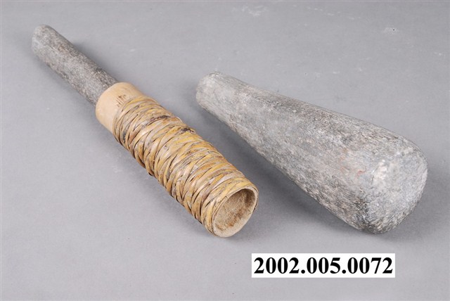 本物件為石杵,整體呈現上窄下寬的樣式。中間段為竹筒,外層以竹繩綁繫。兩端各連接一段石質圓柱形體。有一端已脫離。