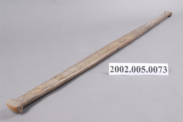 本物件為木扁擔,木質。該物件為一根削製的木頭,由外觀可見中段相較較寬,兩端略為細扁。兩端末端可見突起設計,藉以阻擋兩端的垂掛物品滑落。
