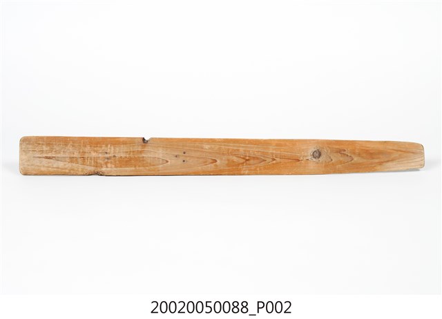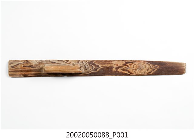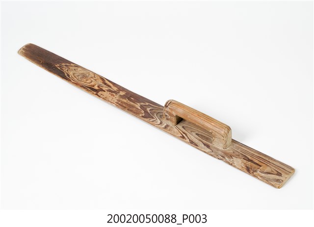 本件文物為抹刀,木質,是秧田整地的農具。抹刀分為刀面與刀柄,早期兩者間以卡榫、木釘固定,後改為鐵條或鐵釘,本件使用鐵釘。抹刀用來抹平秧田表土,抹平後播下穀種,再用抹刀輕輕將穀種壓入泥中,以免被風吹走或遭鳥啄食。土水司傅亦使用木抹刀粉光牆面,但其一般使用的木抹刀刀面較短,農用木抹刀較長,便於一次施作於大面積秧田。農用抹刀刀面分為前端尖形及長方形兩種,本件為長方形。