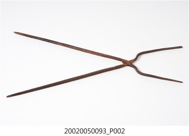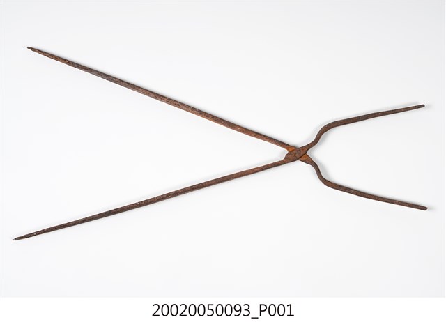 本文物為火鉗,為廚房燒炭磚灶用具。火鉗以兩支鐵條構成,前端彎弧圍成圈形,後端為直條,彎弧轉為直條處作成片狀,兩片以可轉動軸接合。使用時手握直條端,以彎弧的前端夾起木炭,送入大灶中。磚灶在1930年代中期後開始出現於民家廚房,戰後開始普及,初期皆以燒木材為主,後街區多改用木炭,因此需以火鉗作為夾取工具,以免燙手,鄉村因可撿拾免費的木材,仍以燒柴為多。到1970年代燒木炭的灶仍為街區廚房常使用的灶,後隨液態瓦斯桶的普及,燒柴或木炭的磚灶逐漸消失,火鉗亦隨之減少。