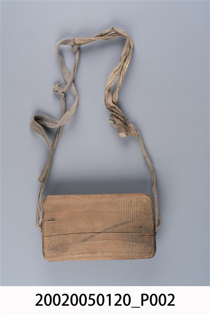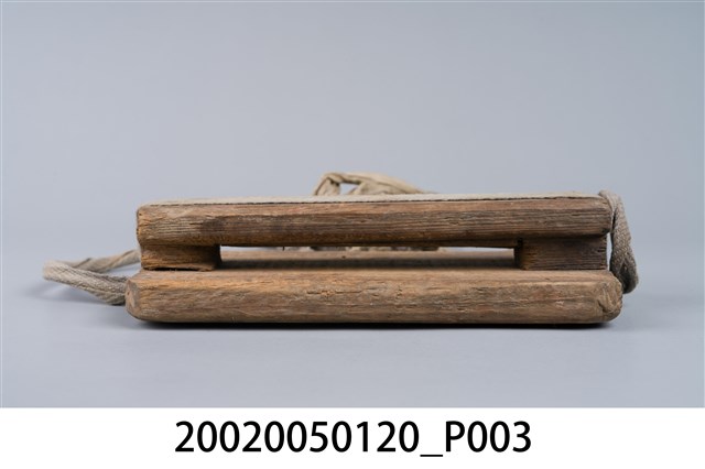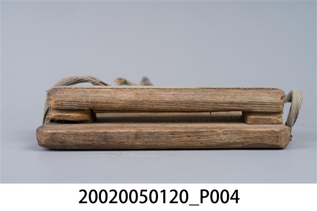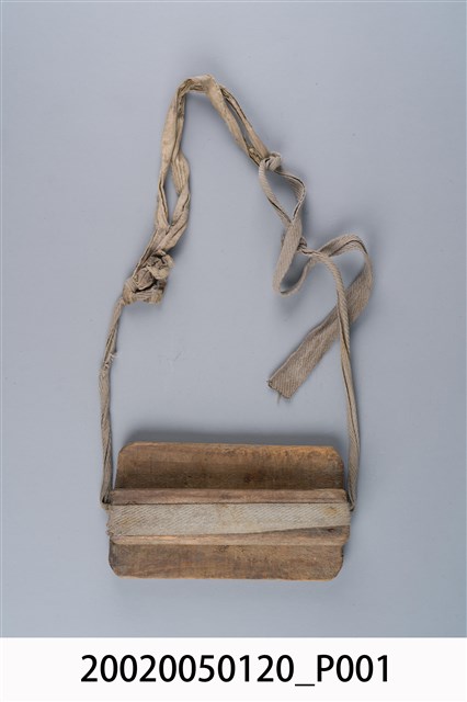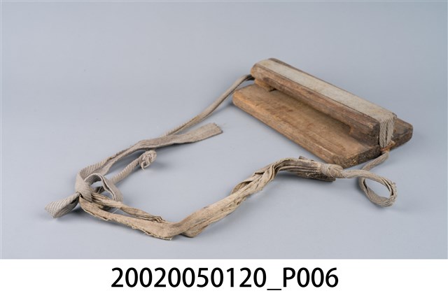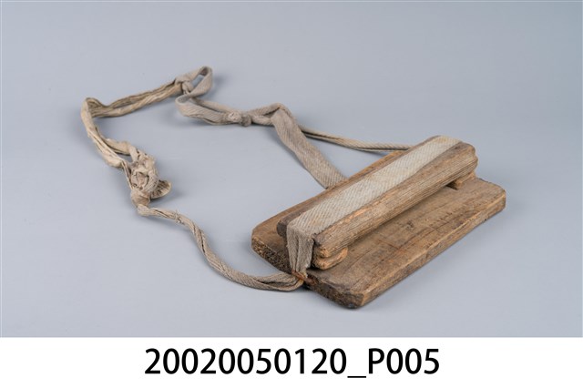 2.木刀鞘,又稱刀匣、刀稍,是早期上山砍柴、劈竹時放置柴刀的工具。通常由四片木板、鐵釘及繩子組合而成,其中1片長條狀木片當基座,2片小片留一間隙置中間,上面再蓋以另1片木板最後以鐵釘固定預留中間縫隙,即為插刀之處;基座木片2側端各釘上鐵釘,折彎成環狀綁上繩子,最後將繩子繫於腰際,擺置在腰背後,不會妨礙走路與工作。早期繫於2端之繩子通常使用草繩、麻繩等。