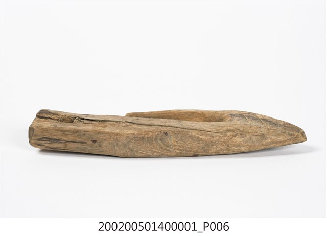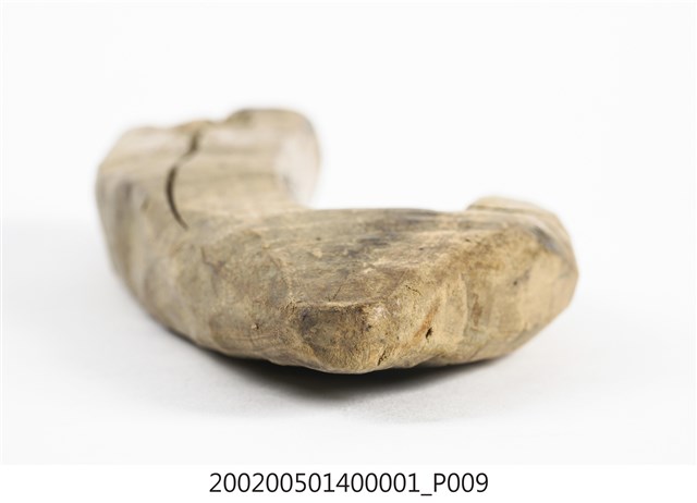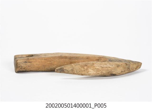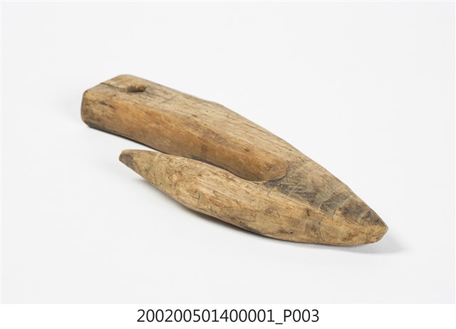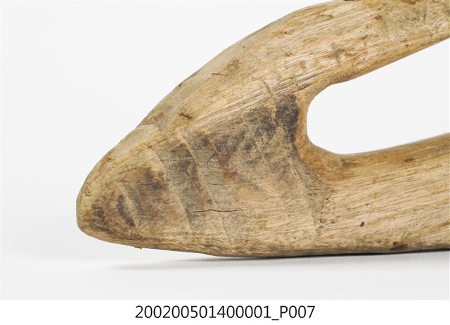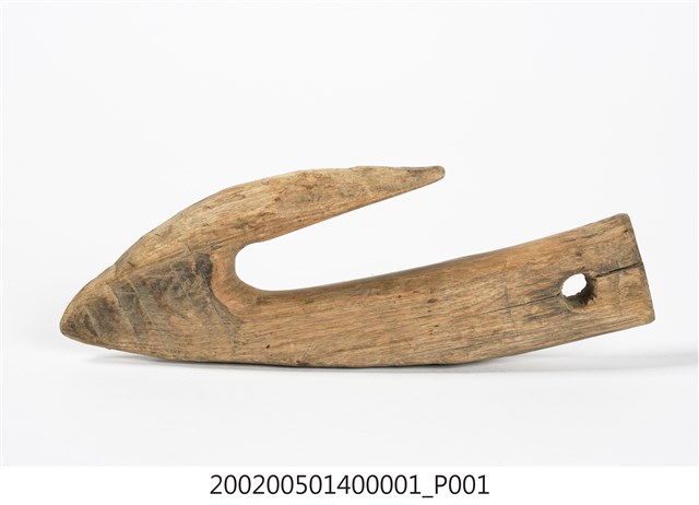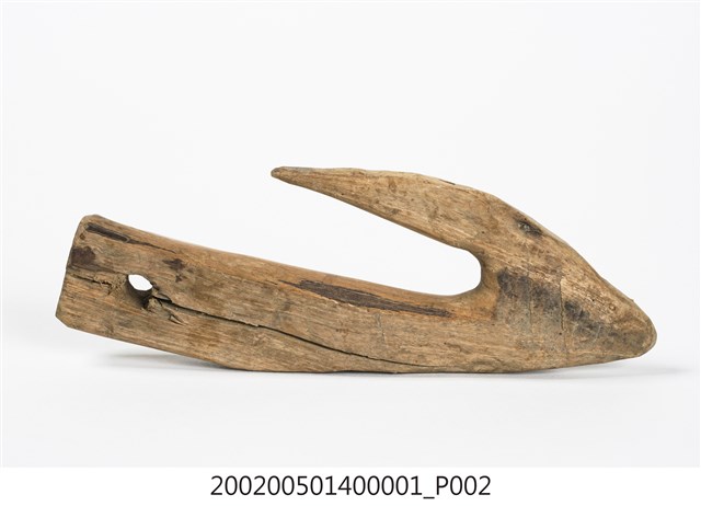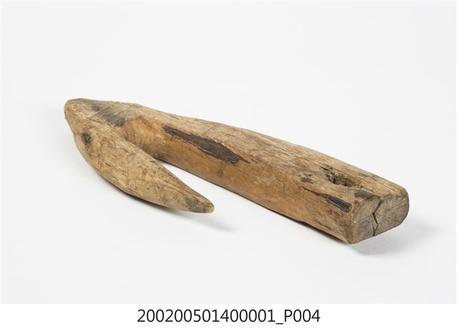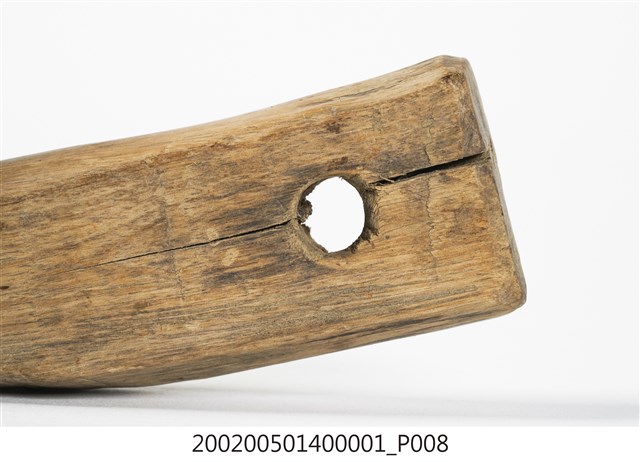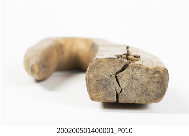 本物件為木勾,木製材質。該物件外觀整體有使用痕跡,物件上方有一個圓孔,圓孔上方有一道裂痕。