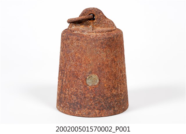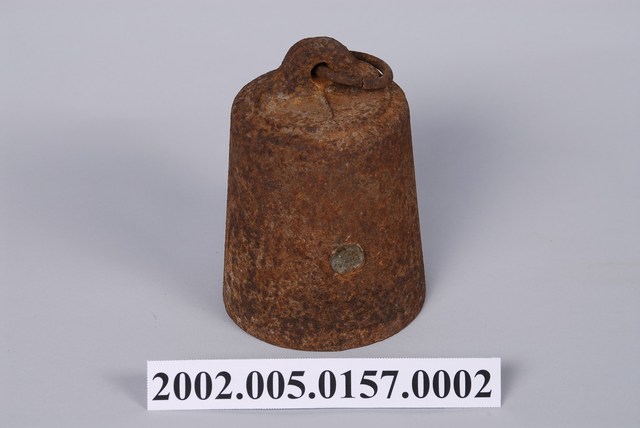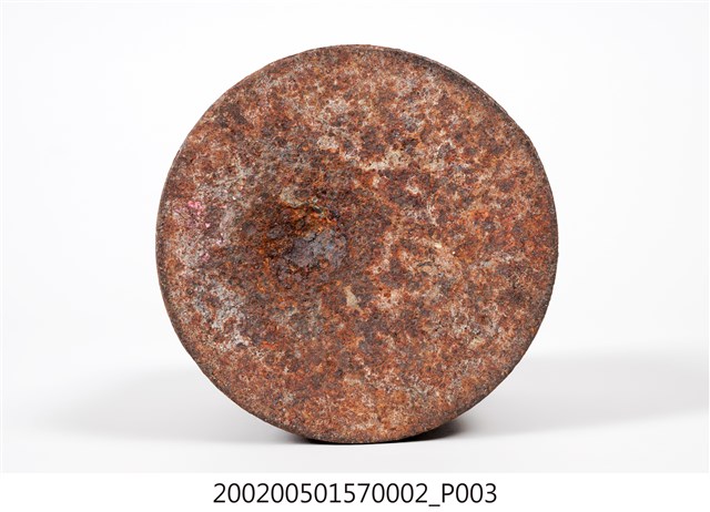 1.本物件為鐵製秤錘,外觀生鏽,錘頂上方圓孔嵌有鐵環,錘體外圍有1圓形凸起鐵片。