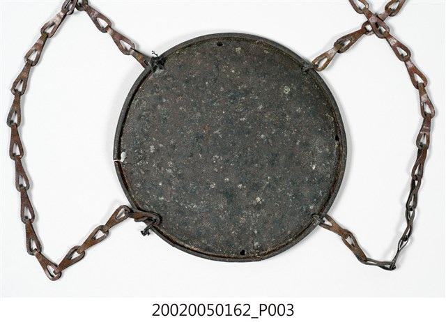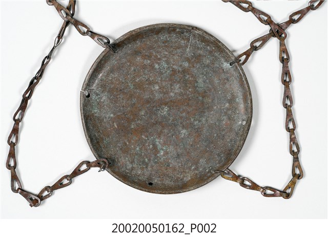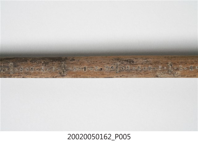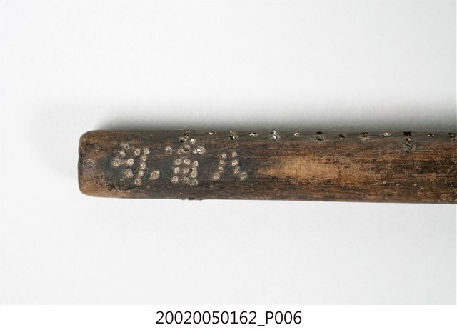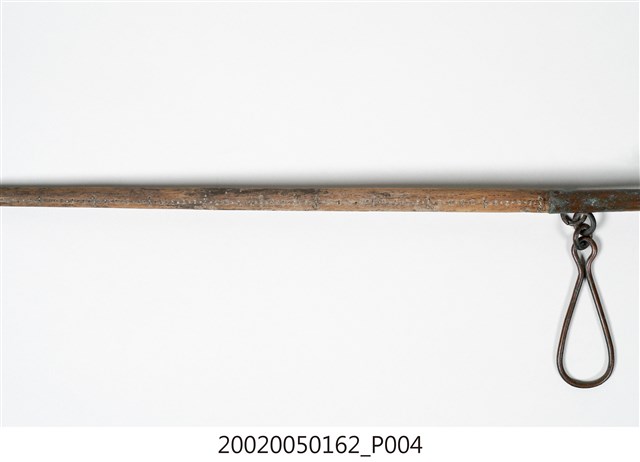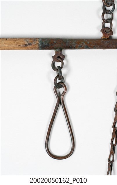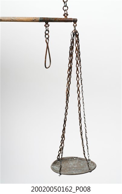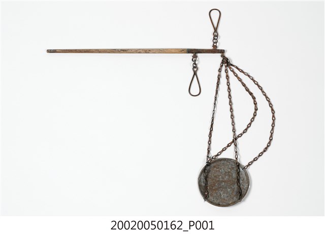1.本物件是「厘秤」,其構造分為鐵製的秤頭及木質的圓形長桿2部份。秤頭有以4條鐵鍊固定的鐵製懸掛式秤盤可放置物品,2側各有1個鐵製提耳,前者秤較重的,後者秤較輕的;秤桿上刻有刻度。厘秤也稱「戥仔」是用來秤金銀珠寶或藥品等分釐小數的東西,以兩錢分釐為單位。