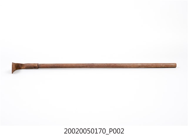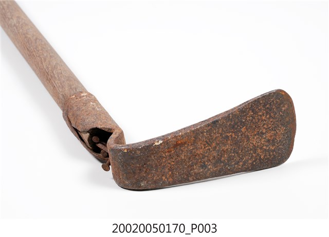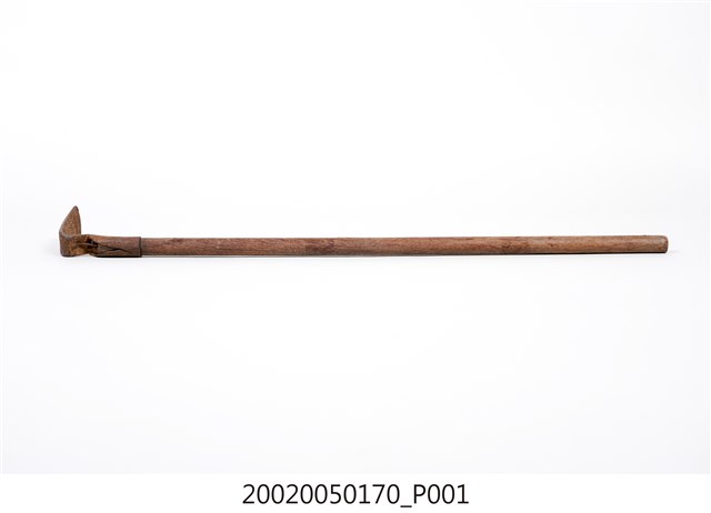 本文物為鋤頭,為過去至今田園、園藝常用的農具,以鐵製鋤頭與木柄構成。本件鋤頭面較窄,木柄與鋤頭面的角度較大,適合石礫地或硬土地等山間田園深掘使用,因此又稱山鋤。亦可用於海坪,在金門用以挖沙蟲。鋤口為弧形,後端收為圓筒箍以置木柄。鋤頭柄有長柄、短柄之分,本件為木長柄。鋤頭可以其口薄挖土面,或以其面盛少量土移動,用途廣泛,包括翻土、整畦、除草、處理堆肥、蓋土、收穫、整理水溝等。本件鋤頭長寬面較一般鋤頭小,可用以處理挖土洞等較小面積的工作。