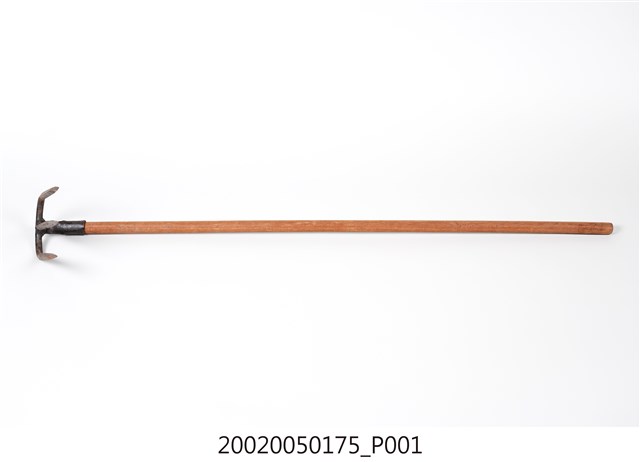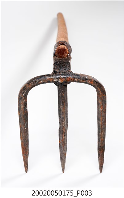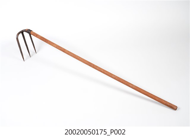 本文物為三齒耙,或簡稱三齒,因有三齒而名之,為田地整畦、鬆土、除草根的農具,亦可用於整理溝渠。本件三齒齒尖而長,利於山林硬土地或石礫地使用。三齒尾端收成鐵片,再接圓筒形箍以置木柄,並塞以木片、鐵片固定,為清末至今傳統漢式農具作法。