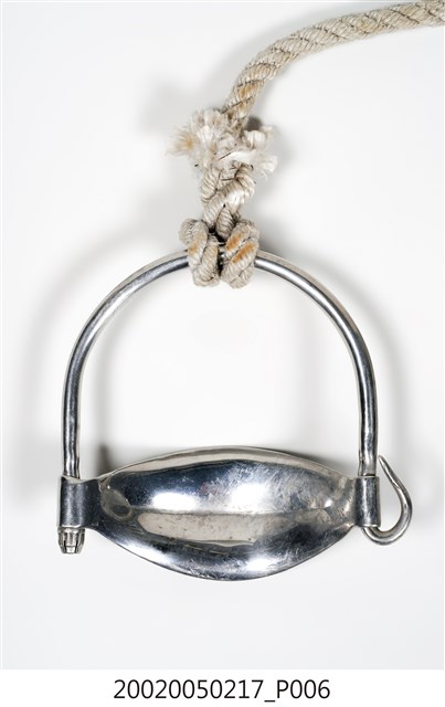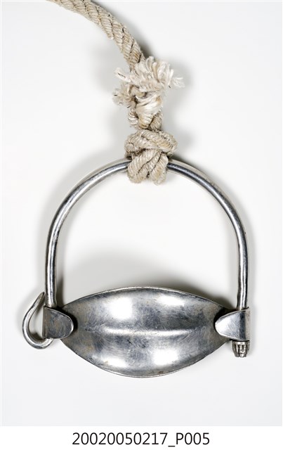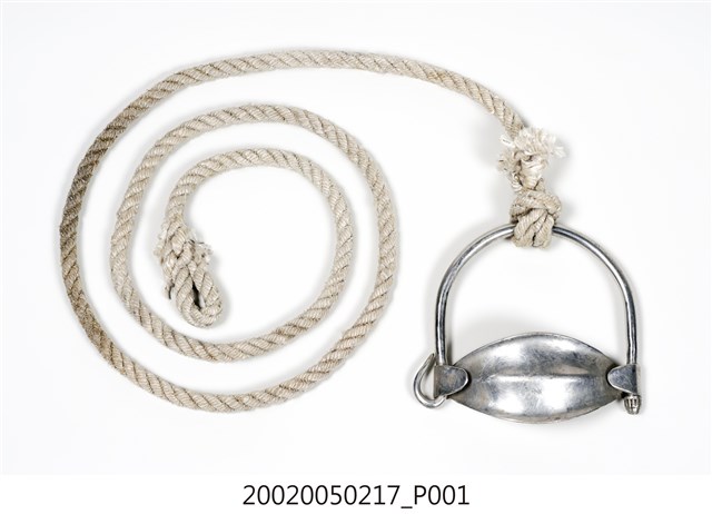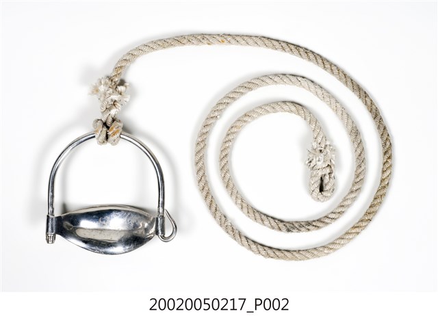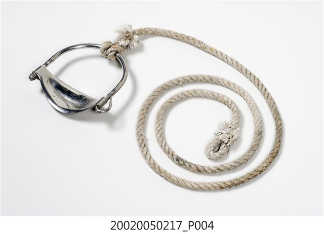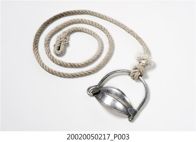 1.本物件為牛鼻栓,主體為金屬材質。該物件為一個複合金屬,一頭繫上棉繩,有使用痕跡。