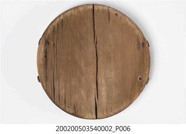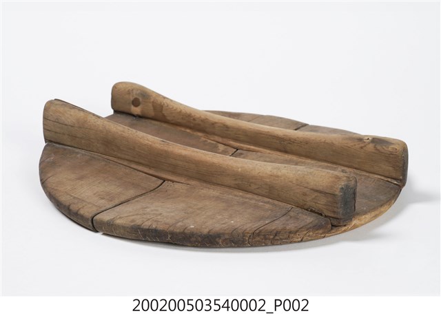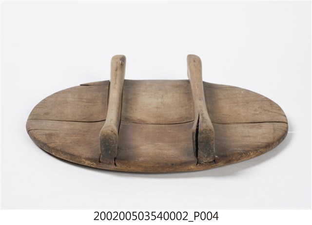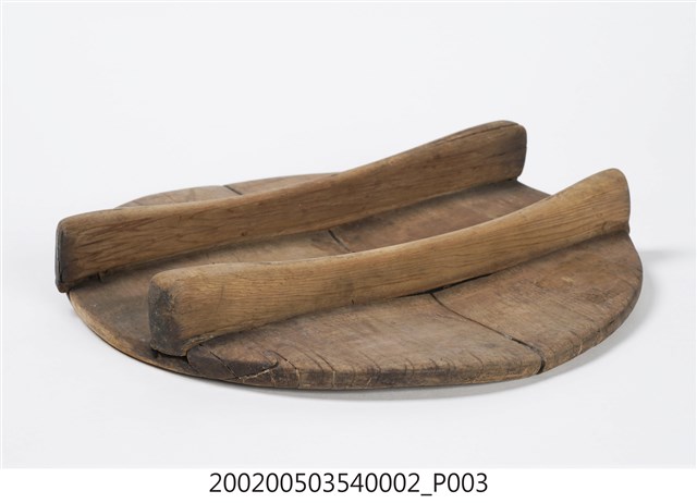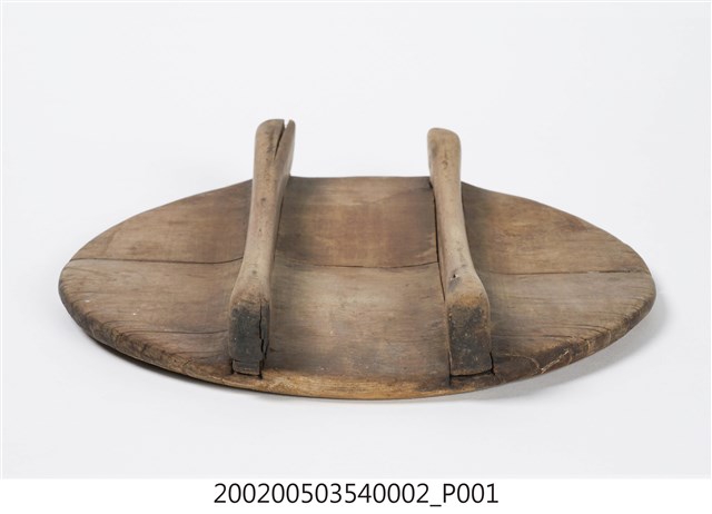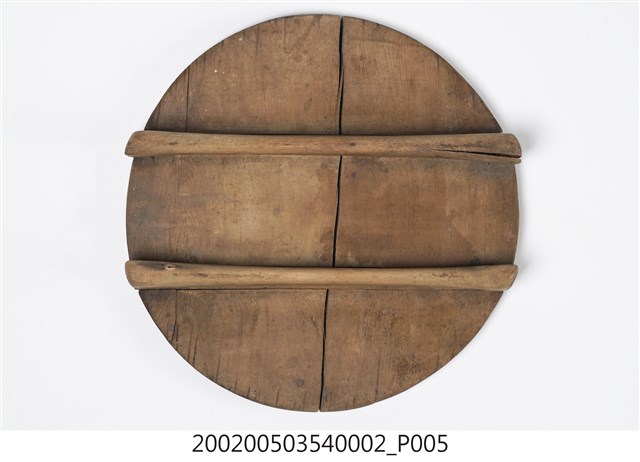 由兩片木板拼製而成的圓板,原木色,外側上方有兩條長形木塊凸起,方便拿取。飯斗蓋一般用來蓋在飯斗桶身上方,用來保溫和防止落塵或其他異物掉進飯裡。