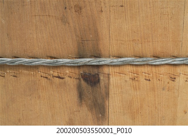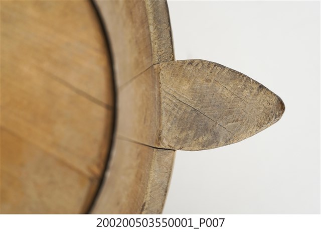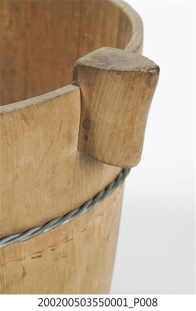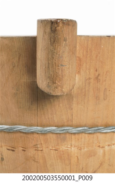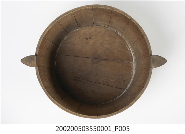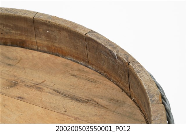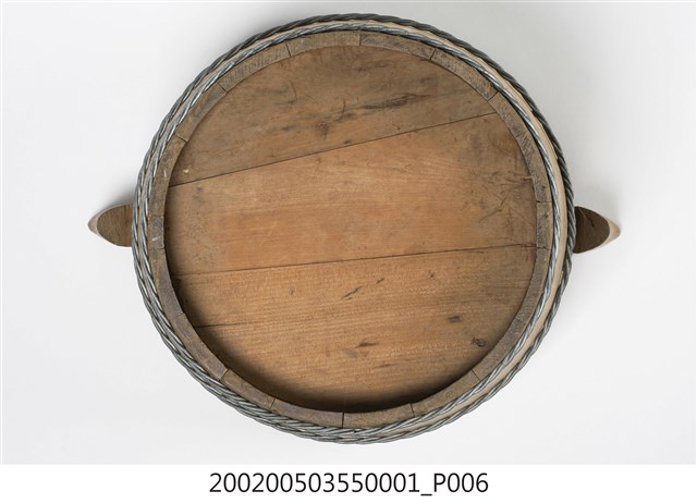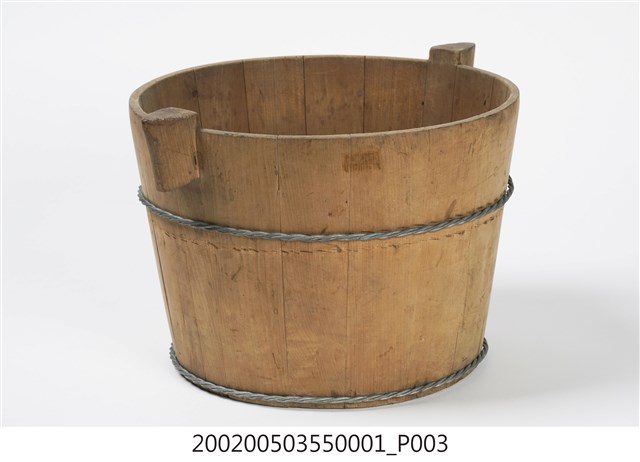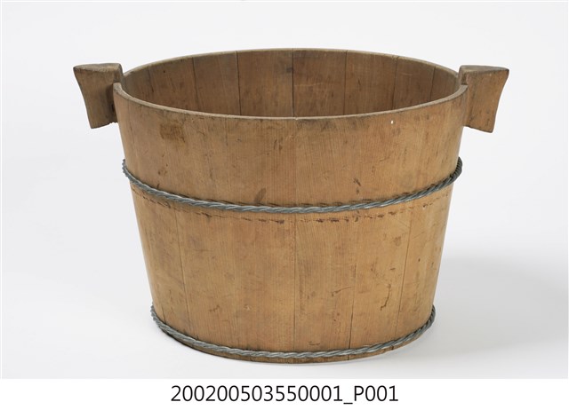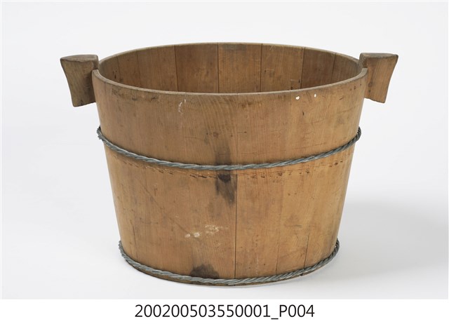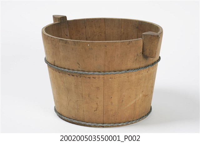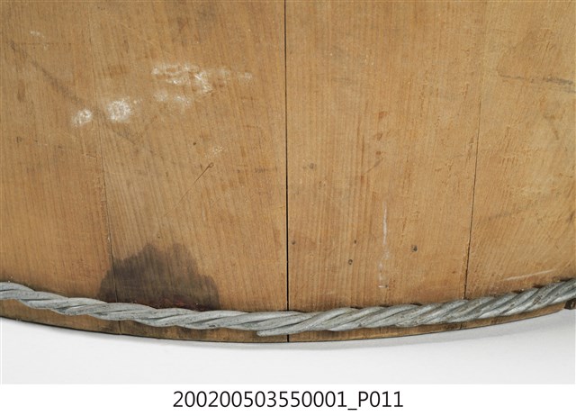 由十五塊木板一片一片圍攏起來的圓桶狀,原木色,上寬下瘦,腹部和底部以鐵絲圈起,左右各有一凸出之耳朵形木塊作為把手,方便端移。