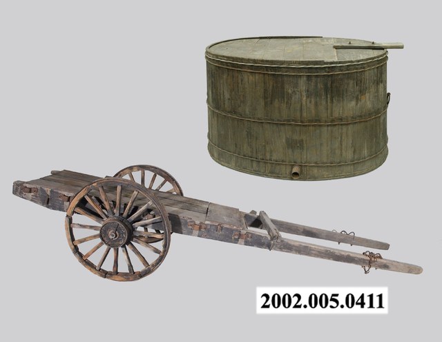本物件為灌溉桶與板車,組成為一臺推車及桶子,材質皆為木頭,推車為兩輪,有兩個握把,桶子有出水孔及蓋子。