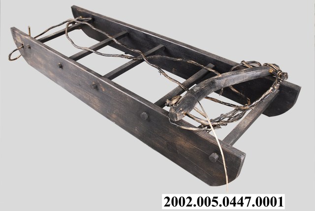 1.本物件為林業用具木馬的主體。木馬的形狀類似雪橇。兩側是木馬板,平底,上邊較下邊為長。兩木馬板間隔前面比後面略寬,前後共連接5根橫桿;橫桿兩頭穿出木馬板,穿出處以圓榫固定。
