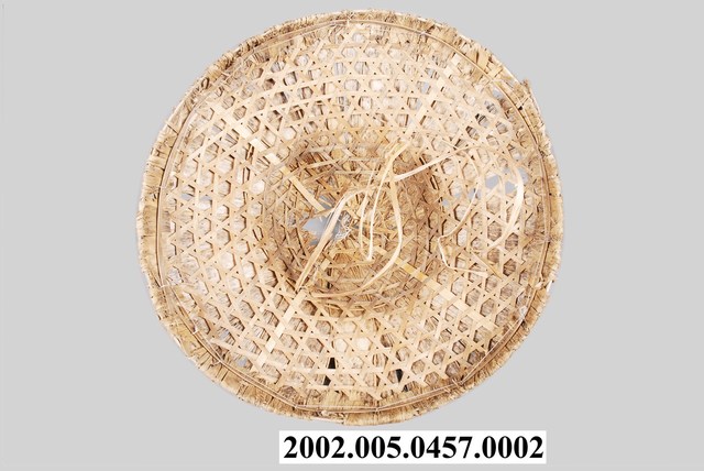 1.本物件為斗笠。圓底尖頂。裡部兩條竹篾十字交叉,再以若干條竹篾交叉斜織,構成骨架;在竹篾骨架上覆上竹籜,並有棉線紮住竹籜與竹篾固定。