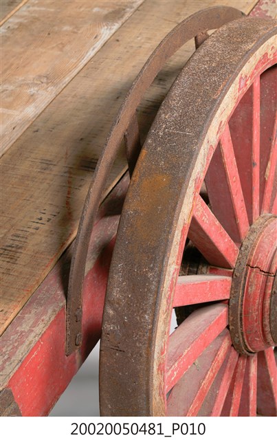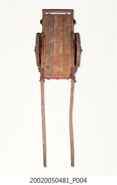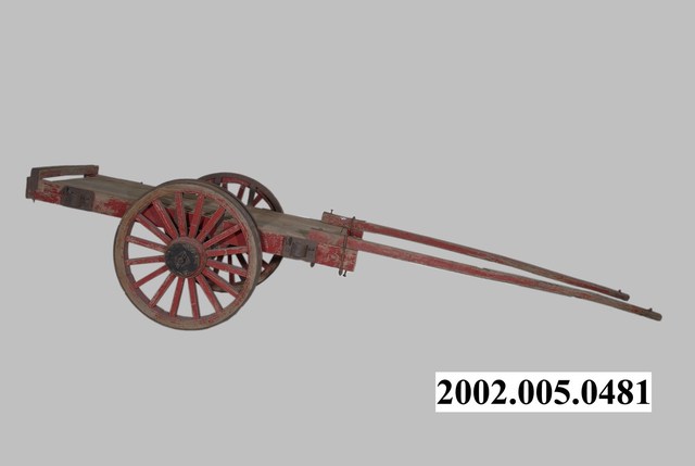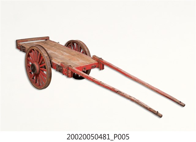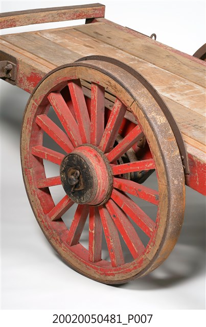1.本文物為雙輪牛車。全車一共有3個部件,分別是車體載重臺,兩側鐵皮輪。全車為木製基底搭配鐵製配件,整體外觀為紅色。以車輪而言,皆為木製幅軸車輪,輪外上鐵皮。
