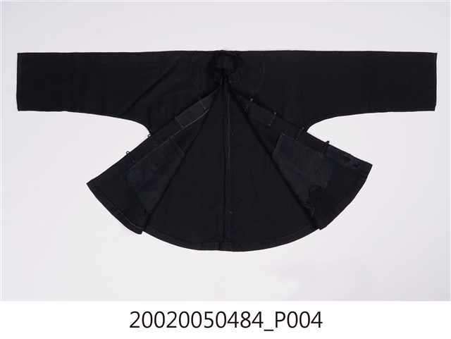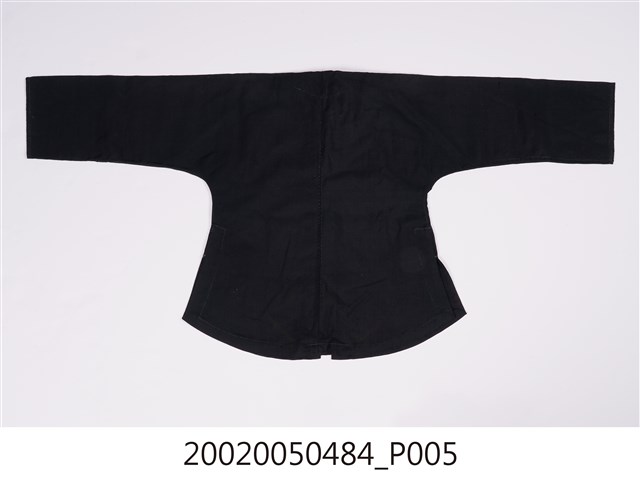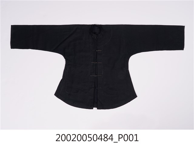 此為臺灣早期漢族男子傳統服飾,結構為立領、對襟、長袖的單層短上衣,直布裁剪的小立領,頷下和對襟上有五對直布扣,布扣都是以本布結纽頭的形式製作,縫製方式以縫紉機車縫,在前身下方貼縫二個大口袋,衣身版型短而下襬略往外延展;棉布製作的上衣,下身搭配大襠褲,是早期最為普遍的日常穿著服式。本件服裝在台灣民間稱為「對襟仔衫」,是早期男子最普遍穿著的上衣。