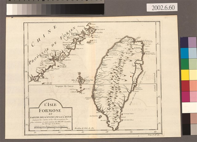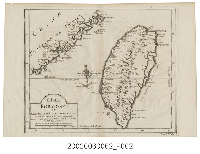 臺灣西海岸記錄的港口或城鎮,有小雞籠(Sioa-Ki-long)、淡水廳(Tan chouit ching)、八里坌(Patifan)、南嵌社(Nan sa che)、南大溪(Nantaki)、吞霄社(Tchou tchan che)、竹塹社(Tchong Kiang che)、後龍社(Heou long che)、大甲(Tatial)、大肚社(Ta tou che)、半線(Pensiening)、東螺(Tonglo)等,雞籠城與熱蘭遮城則標示已頹圮。至於東海岸則以法文註記「Toute cette coste est très peu connue」,意為「對東岸所知不多」,還將秀姑巒溪誤解成分割花東海岸山脈的長條狀內海。有經緯度,並在底邊標示,中央經線起自Ferro 島(西非加納利群島西端,約今西經20度),地圖上方指北。
