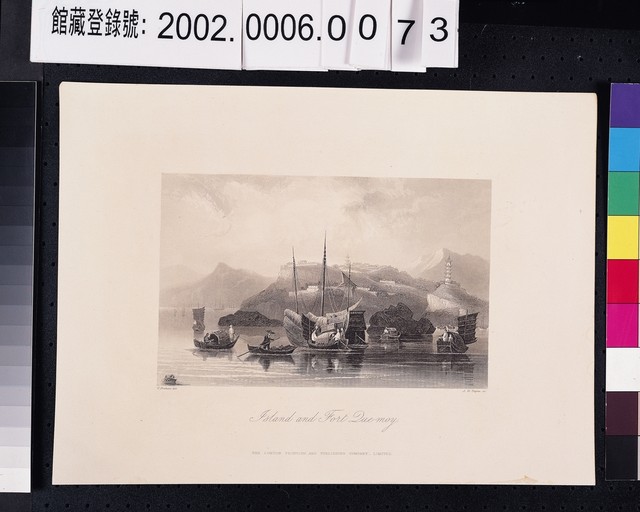 本物件是一幅描述金門港口的鋼版印刷圖,背景有起伏的山丘,山頂正中及最右側,各有一座塔(中間應為文台寶塔,右側應為茅山塔);水上中央有一艘大帆船,六艘小船,更遠的背景有更多的帆船。此圖由C. Graham所繪,後由英國的鋼版雕刻家和畫家佩胤(A. H. Payne)作成鋼板雕刻。這幅圖後來收錄在佩胤於1845年出版的作品集《Payne's universum ; or, Pictorial world : being a collection of engravings of views in all countries, portraits of great men, and specimens of works of art, of all ages and of every character》,第二冊的第132頁,第133至134頁是金門的歷史背景的描述。