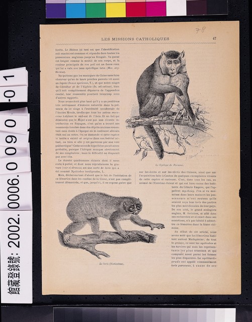 1. 本物件為《天主教傳教團》(Les Missions Catholiques)於1889年1月4日所發行的刊物。於第46頁至48頁為天主教牧師 M. Armand David 所撰寫的一篇短文:“Faune et Flore Chinoises -- Les Singes“(中國的動植物 -- 猴子)。第47頁共附兩張臺灣獼猴及慢猴(Le Cyclope de Formose, Le loris(Nicticebus))的插畫。1860年代,英國領事館即位於打狗猴山下,當時擔任領事的郇和(史溫侯,Robert Swinhoe),曾對山上的獼猴做過詳細觀察。