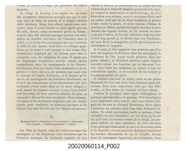 本物件“Lit de la rivière de La-lung pendant la saison sèche”(枯水期的荖濃溪河床)為莫納特(J. Moynet)所繪。此圖收錄在《周遊世界之新航海日誌》(Le Tour du Monde Nouveau Journal des Voyages, Paris: Boulevad Sanit-Germain, 1875,第30期,232頁)。本書為畫報性質,為西方各旅行者遊記之集合。書中209-240頁收有英國攝影家John Thomson 1871年來臺灣南部遊歷之作。文中的版畫為依Thomson所攝相片所重新繪製。