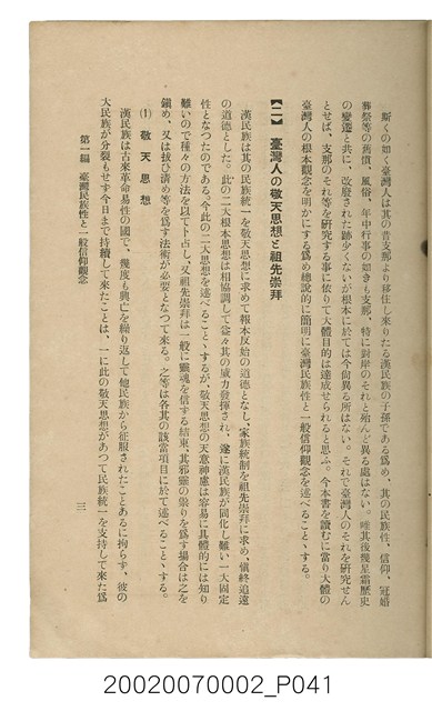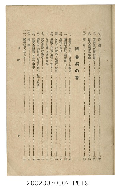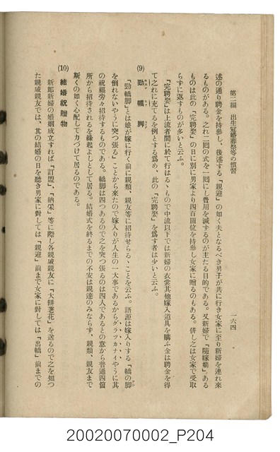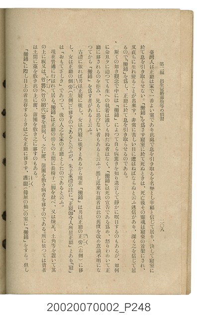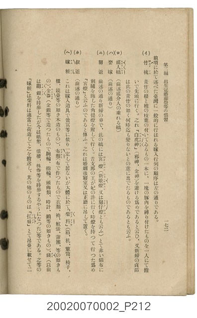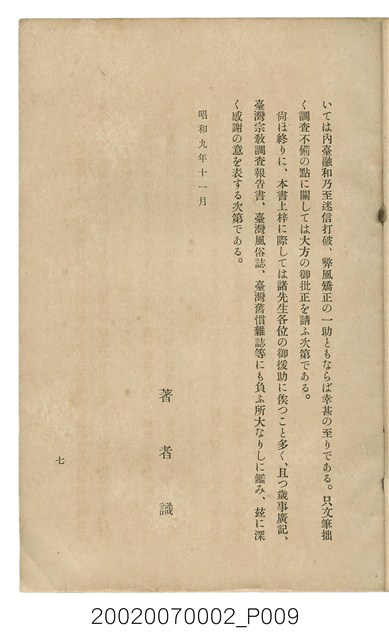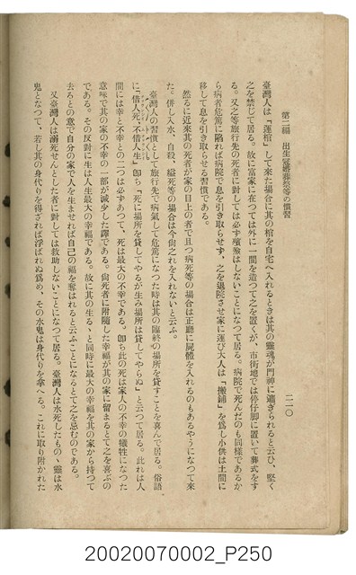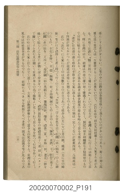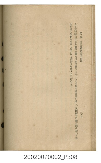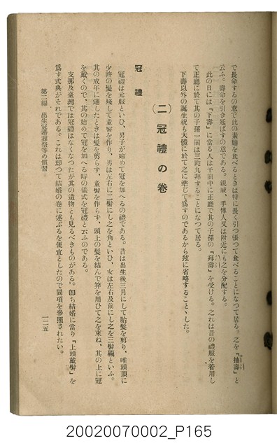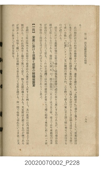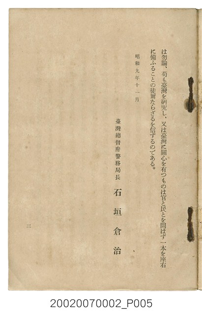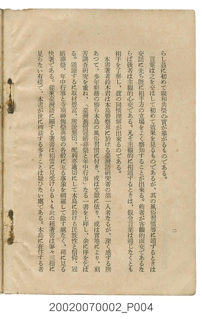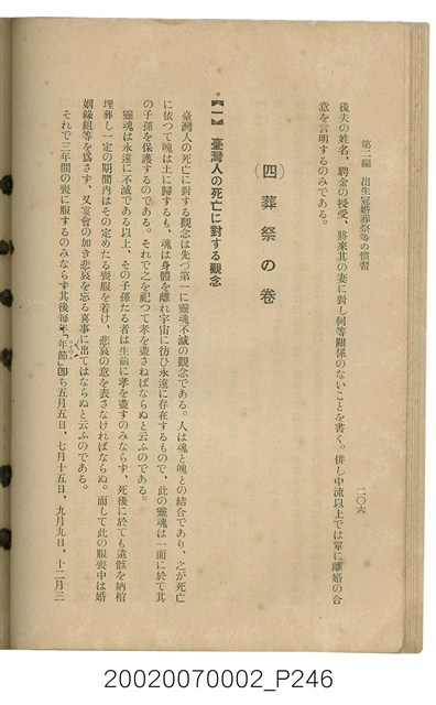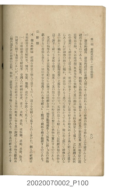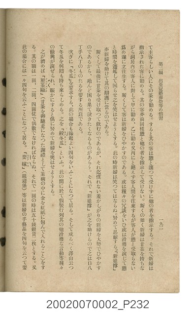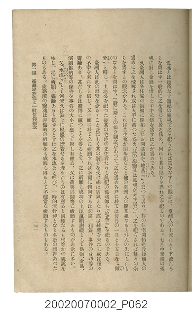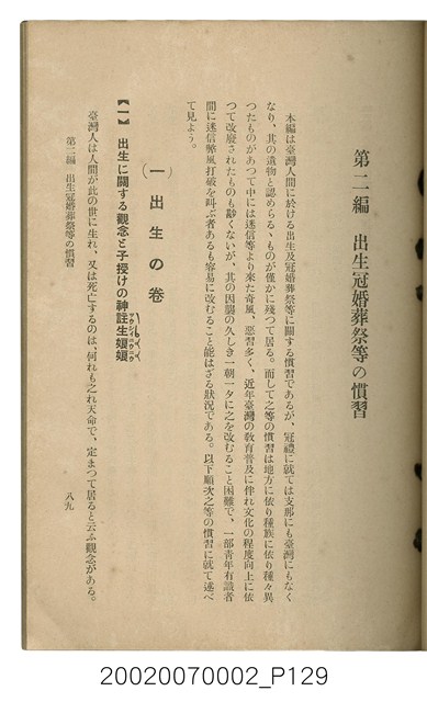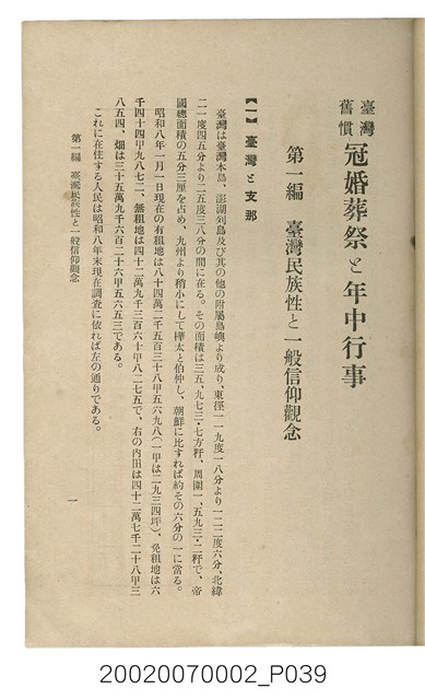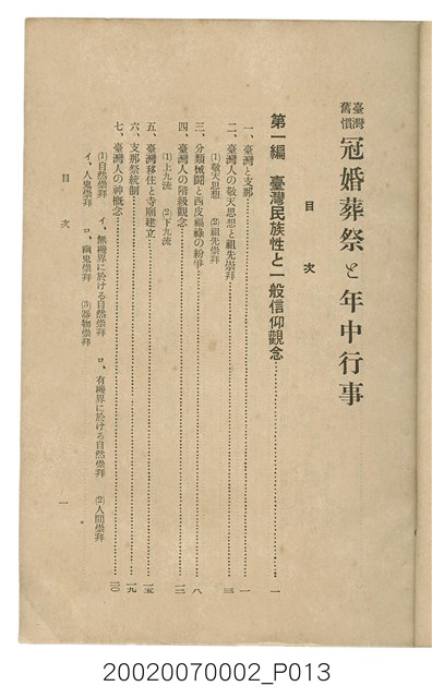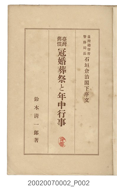 本物件為發行於昭和9年(1934)之《臺灣舊慣:冠婚葬祭與年度活動》,作者鈴木清一郎任職於總督府警務局,從事圖書檢閱的工作。本書內容分為三篇,分別為臺灣民族性與一般信仰觀念、出生冠婚葬祭等的習慣和年中行事與例祭。第一篇共十六章節:臺灣與中國、臺灣人的敬天思想與祖先崇拜、分類械鬥與西皮福祿之爭、臺灣人的階級觀念、移民與寺廟的建立、中國祭統治度、臺灣人的神概念、祠廟中祭神的地位、神軍的觀念、祠廟的分類、神罰與果報、臺灣人的立誓觀念、風水說、祭祀團體、神佛禮拜與祈禱、巫覡術士的法術等;第二篇共四章節:出生、冠禮、結婚和葬祭;第三篇共十二章節,依照月份介紹了整年的慶典活動。其序文為臺灣總督府警務局長石垣倉治所撰。