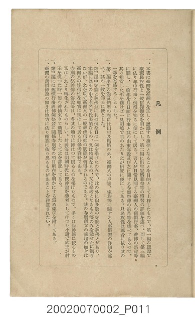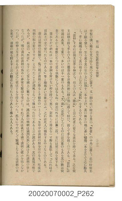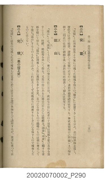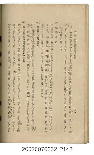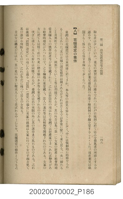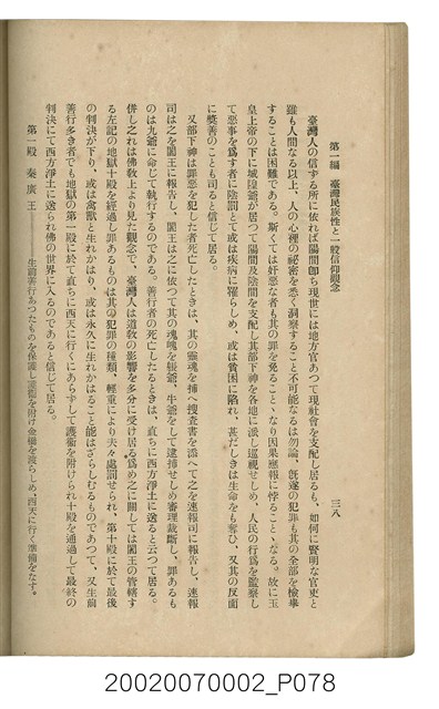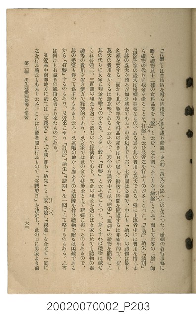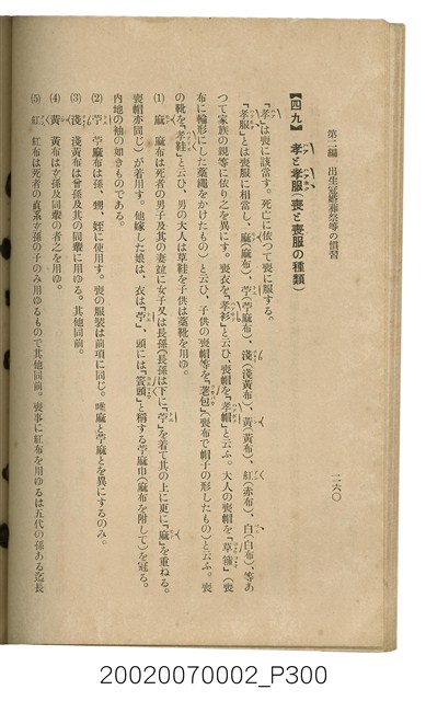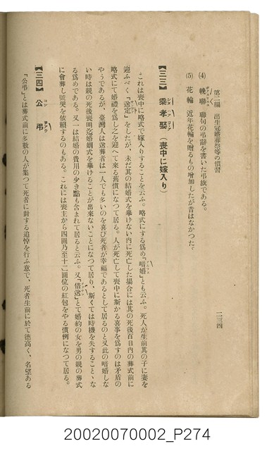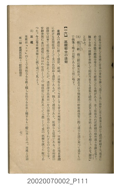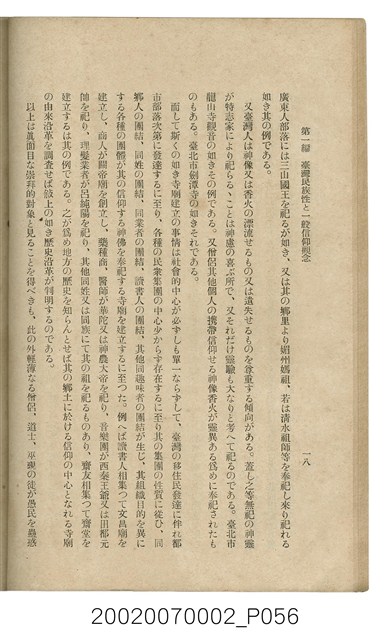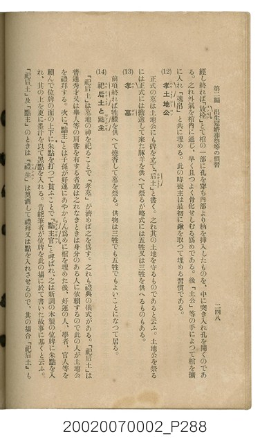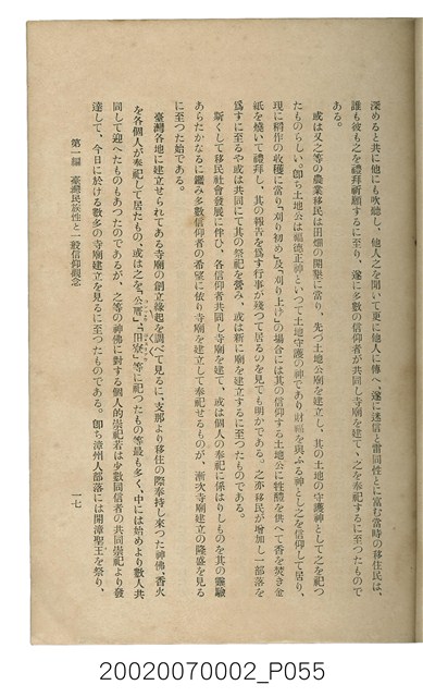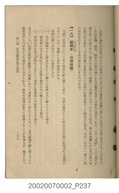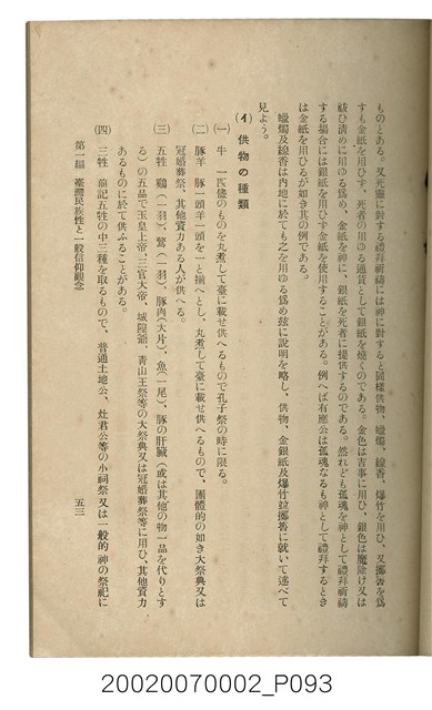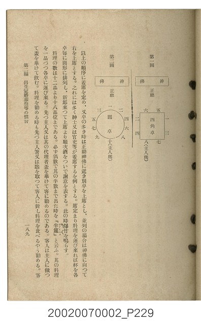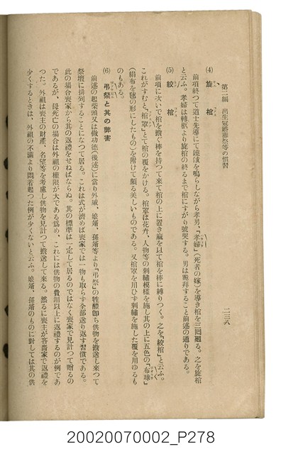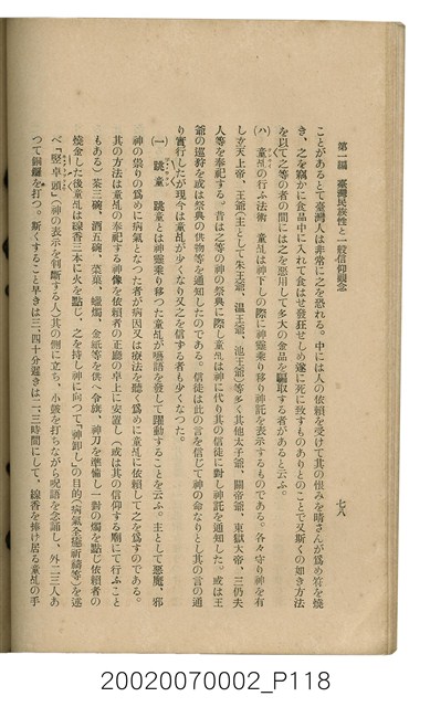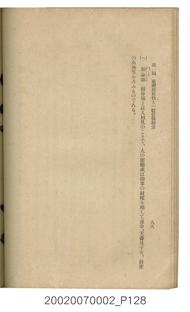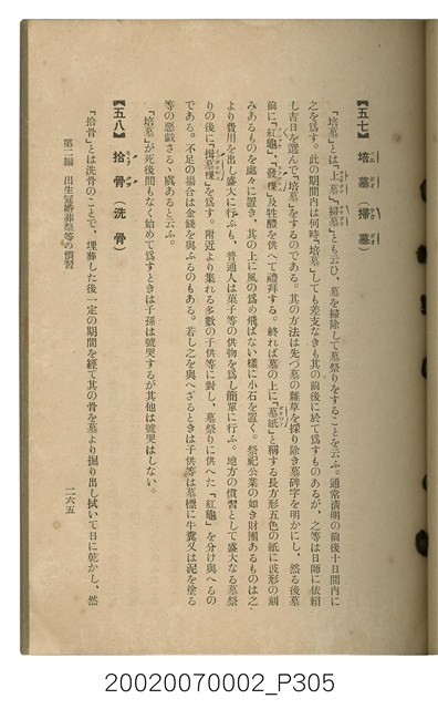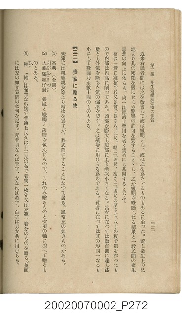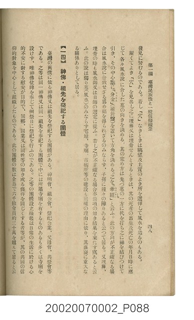 本物件為發行於昭和9年(1934)之《臺灣舊慣:冠婚葬祭與年度活動》,作者鈴木清一郎任職於總督府警務局,從事圖書檢閱的工作。本書內容分為三篇,分別為臺灣民族性與一般信仰觀念、出生冠婚葬祭等的習慣和年中行事與例祭。第一篇共十六章節:臺灣與中國、臺灣人的敬天思想與祖先崇拜、分類械鬥與西皮福祿之爭、臺灣人的階級觀念、移民與寺廟的建立、中國祭統治度、臺灣人的神概念、祠廟中祭神的地位、神軍的觀念、祠廟的分類、神罰與果報、臺灣人的立誓觀念、風水說、祭祀團體、神佛禮拜與祈禱、巫覡術士的法術等;第二篇共四章節:出生、冠禮、結婚和葬祭;第三篇共十二章節,依照月份介紹了整年的慶典活動。其序文為臺灣總督府警務局長石垣倉治所撰。