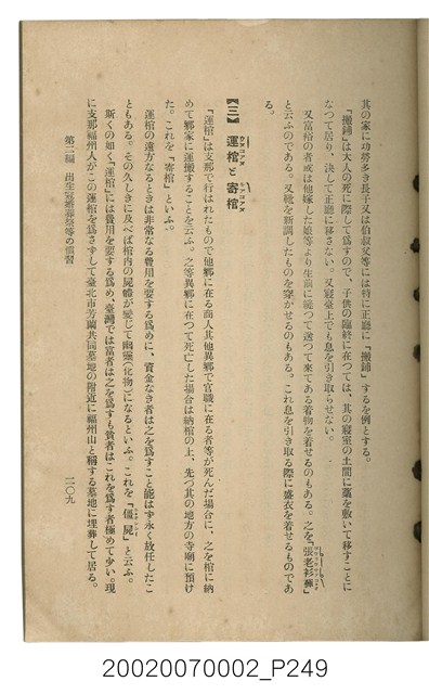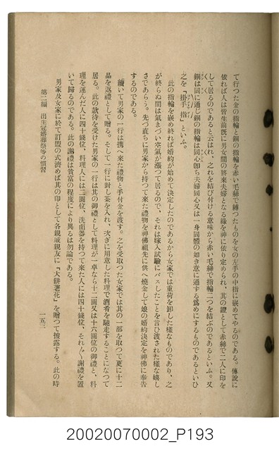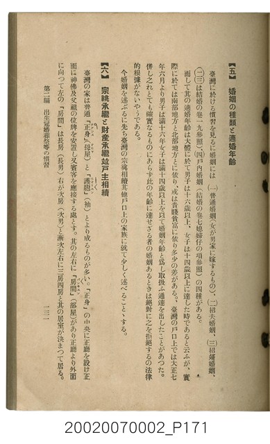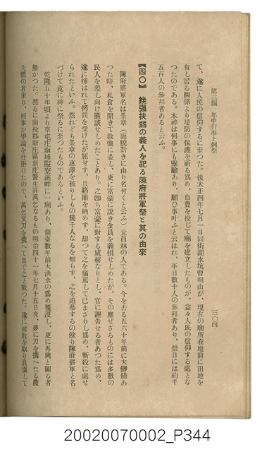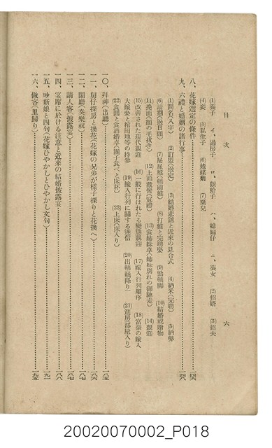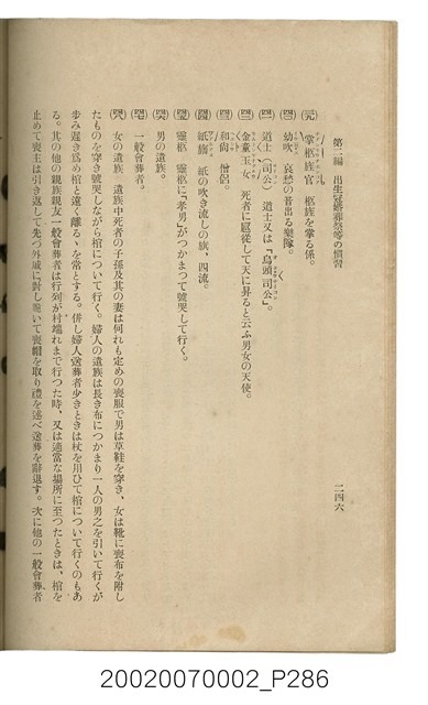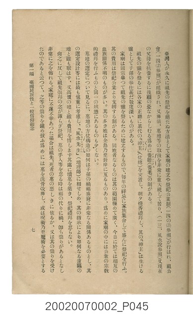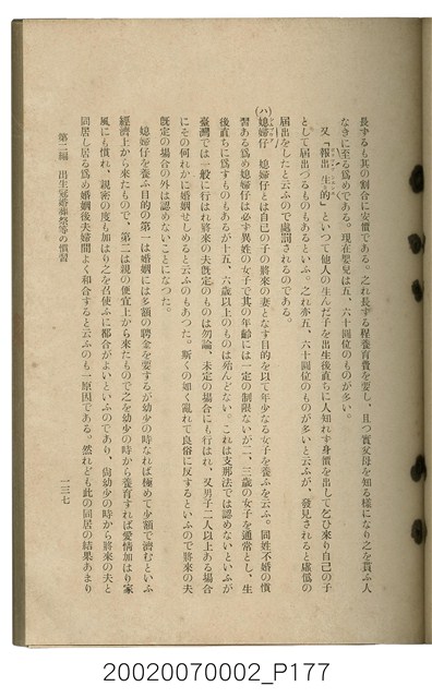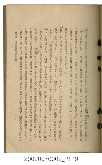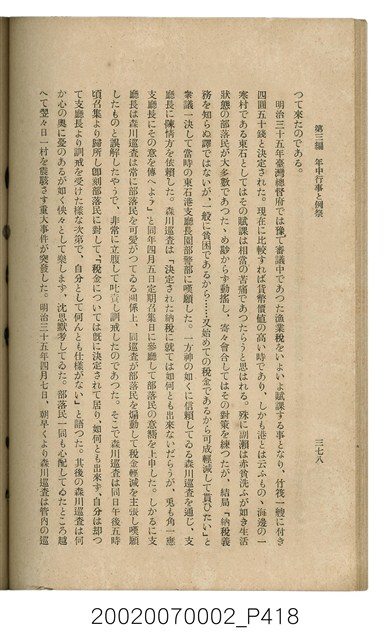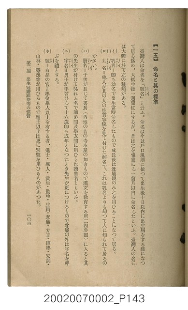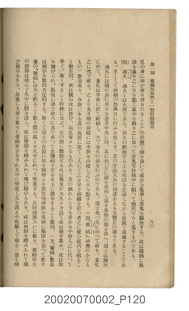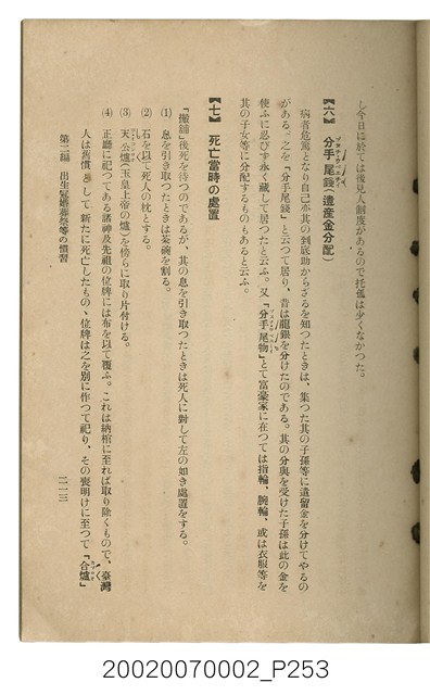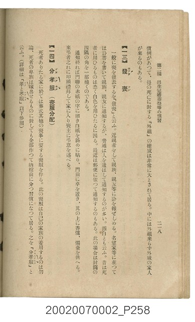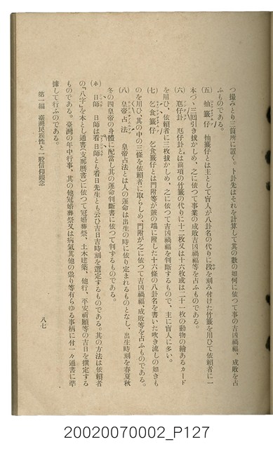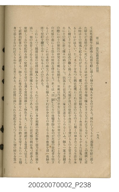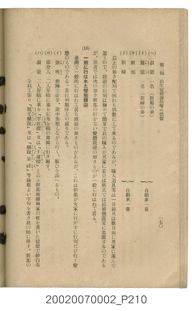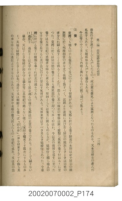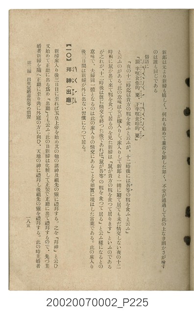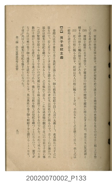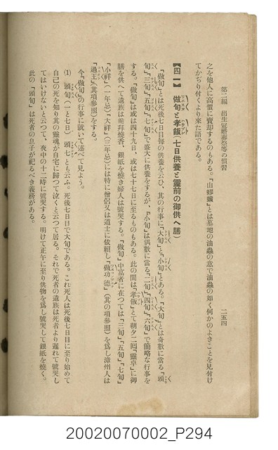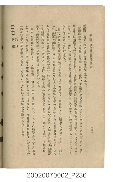 本物件為發行於昭和9年(1934)之《臺灣舊慣:冠婚葬祭與年度活動》,作者鈴木清一郎任職於總督府警務局,從事圖書檢閱的工作。本書內容分為三篇,分別為臺灣民族性與一般信仰觀念、出生冠婚葬祭等的習慣和年中行事與例祭。第一篇共十六章節:臺灣與中國、臺灣人的敬天思想與祖先崇拜、分類械鬥與西皮福祿之爭、臺灣人的階級觀念、移民與寺廟的建立、中國祭統治度、臺灣人的神概念、祠廟中祭神的地位、神軍的觀念、祠廟的分類、神罰與果報、臺灣人的立誓觀念、風水說、祭祀團體、神佛禮拜與祈禱、巫覡術士的法術等;第二篇共四章節:出生、冠禮、結婚和葬祭;第三篇共十二章節,依照月份介紹了整年的慶典活動。其序文為臺灣總督府警務局長石垣倉治所撰。