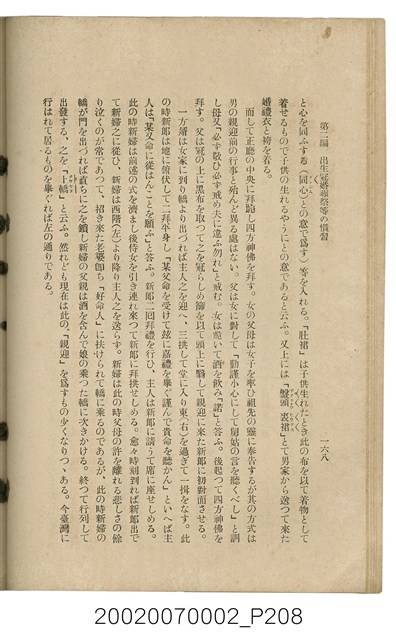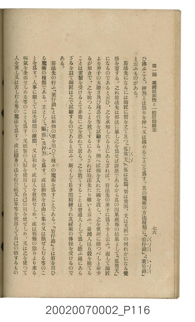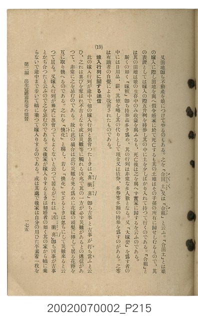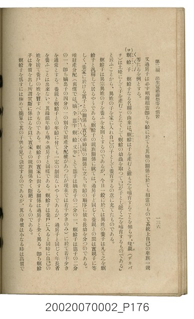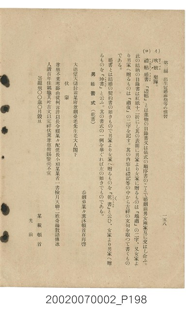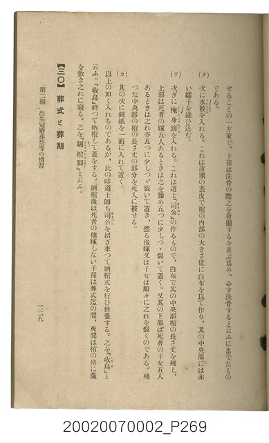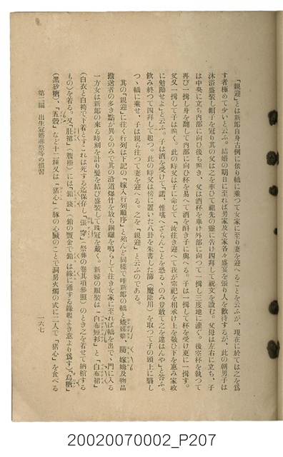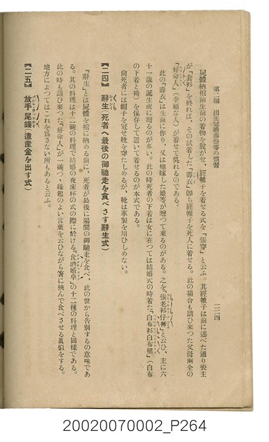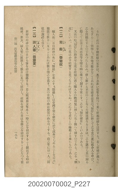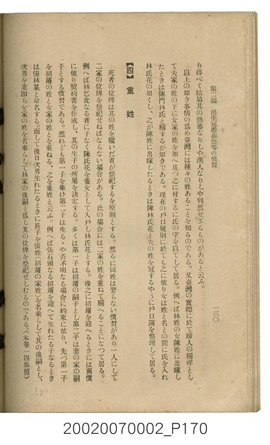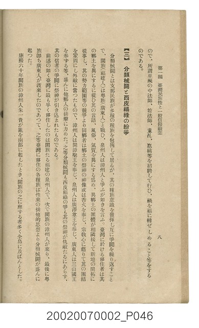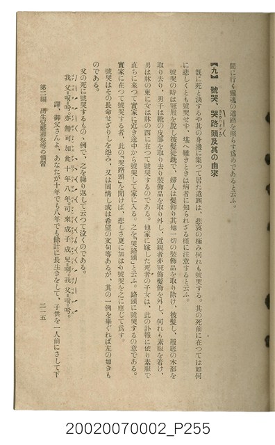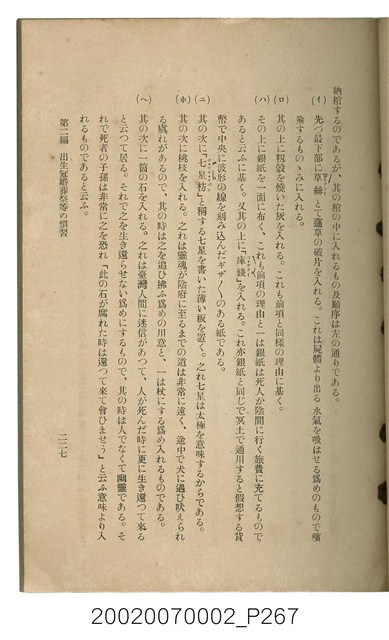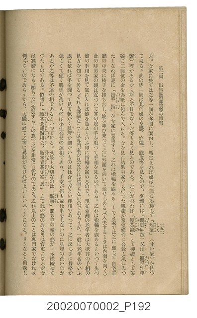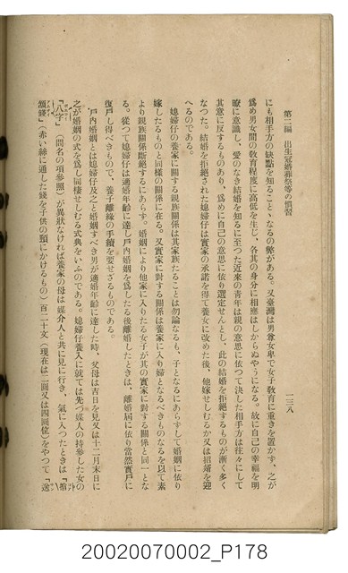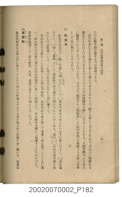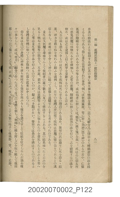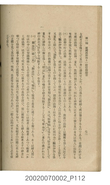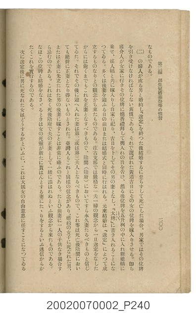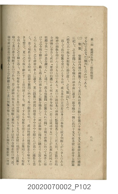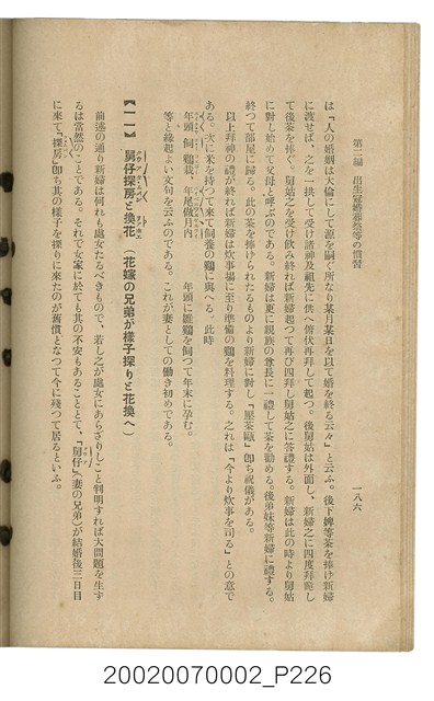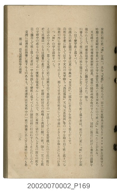 本物件為發行於昭和9年(1934)之《臺灣舊慣:冠婚葬祭與年度活動》,作者鈴木清一郎任職於總督府警務局,從事圖書檢閱的工作。本書內容分為三篇,分別為臺灣民族性與一般信仰觀念、出生冠婚葬祭等的習慣和年中行事與例祭。第一篇共十六章節:臺灣與中國、臺灣人的敬天思想與祖先崇拜、分類械鬥與西皮福祿之爭、臺灣人的階級觀念、移民與寺廟的建立、中國祭統治度、臺灣人的神概念、祠廟中祭神的地位、神軍的觀念、祠廟的分類、神罰與果報、臺灣人的立誓觀念、風水說、祭祀團體、神佛禮拜與祈禱、巫覡術士的法術等;第二篇共四章節:出生、冠禮、結婚和葬祭;第三篇共十二章節,依照月份介紹了整年的慶典活動。其序文為臺灣總督府警務局長石垣倉治所撰。