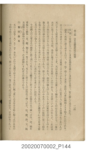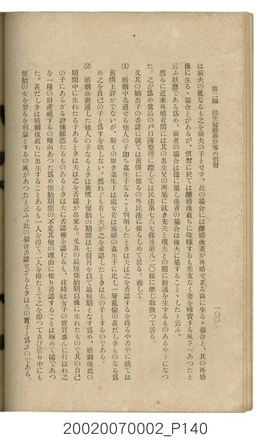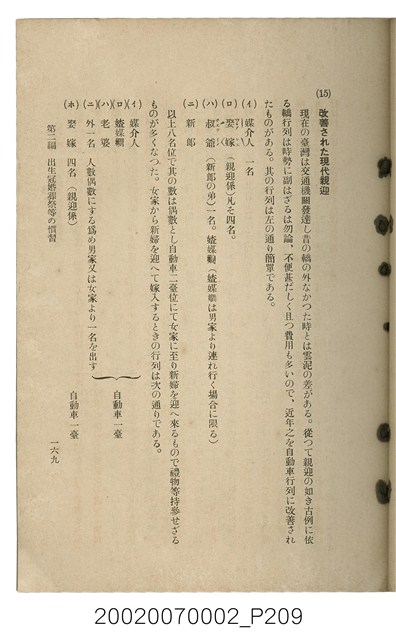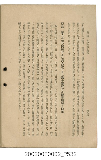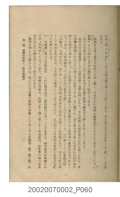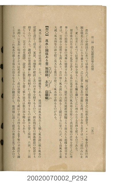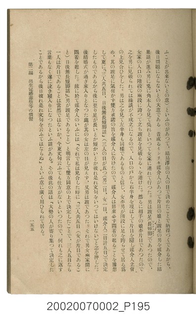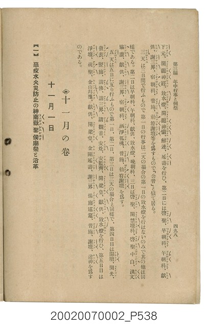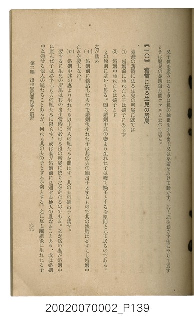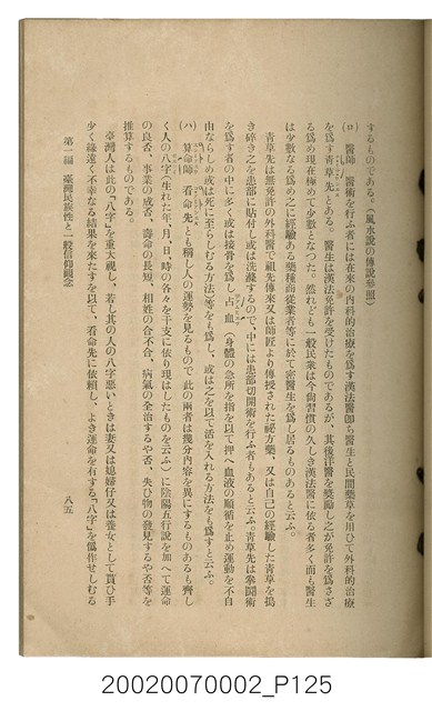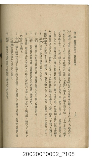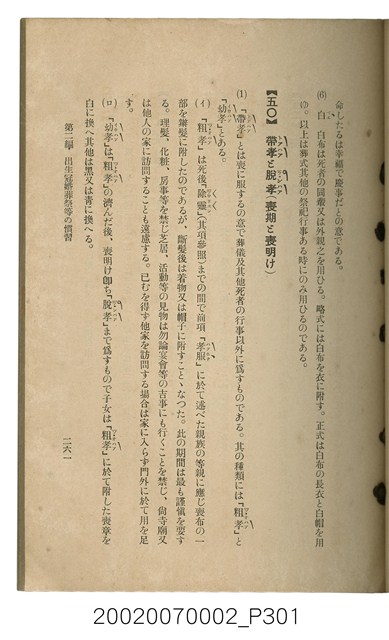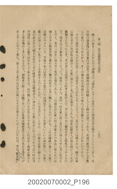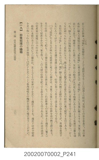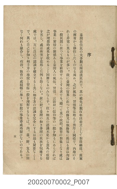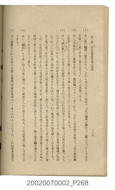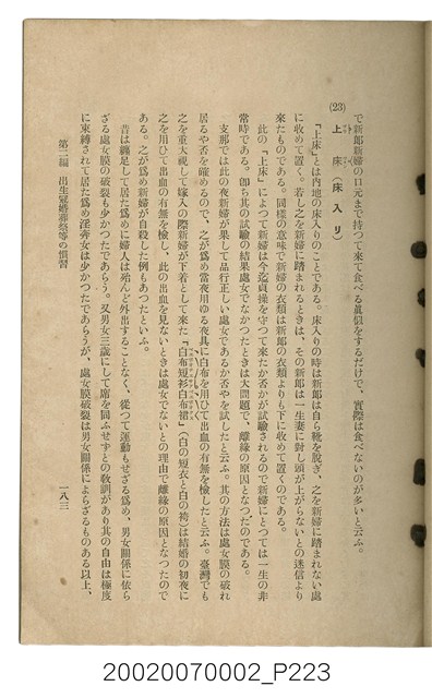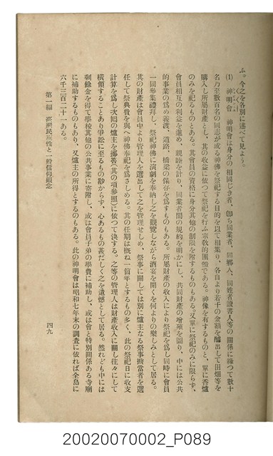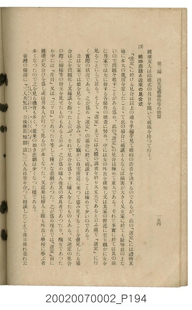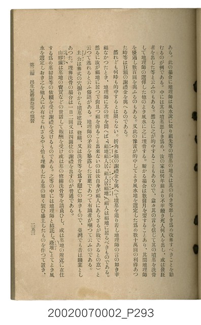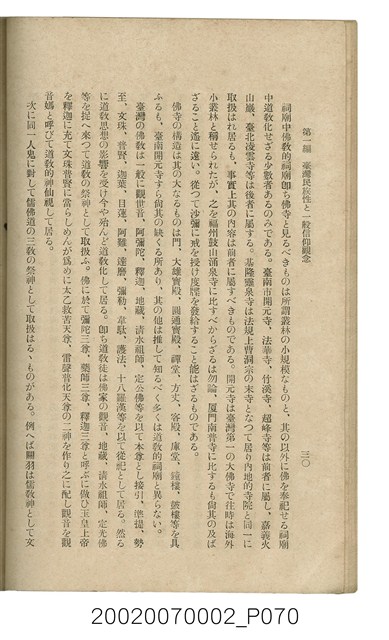 本物件為發行於昭和9年(1934)之《臺灣舊慣:冠婚葬祭與年度活動》,作者鈴木清一郎任職於總督府警務局,從事圖書檢閱的工作。本書內容分為三篇,分別為臺灣民族性與一般信仰觀念、出生冠婚葬祭等的習慣和年中行事與例祭。第一篇共十六章節:臺灣與中國、臺灣人的敬天思想與祖先崇拜、分類械鬥與西皮福祿之爭、臺灣人的階級觀念、移民與寺廟的建立、中國祭統治度、臺灣人的神概念、祠廟中祭神的地位、神軍的觀念、祠廟的分類、神罰與果報、臺灣人的立誓觀念、風水說、祭祀團體、神佛禮拜與祈禱、巫覡術士的法術等;第二篇共四章節:出生、冠禮、結婚和葬祭;第三篇共十二章節,依照月份介紹了整年的慶典活動。其序文為臺灣總督府警務局長石垣倉治所撰。