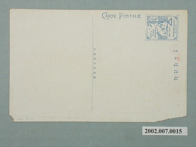 1.本物件為以臺灣總督府為主題之明信片,其正面為臺灣總督府正面彩色繪圖,畫面中可見臺灣總督府廳舍,其建築風格呈現後期文藝復興式,建築整體以紅、白以及上方黑屋瓦為主,樓高五層,中央塔樓更添建築權威意象,而總督府前方有一空曠廣場,可見行人、自行車、汽車經過,明信片下方有「臺灣總督府正面」、「(7)THE GOVERNMENT OF FORMOSA.」;背面為空白明信片直式書寫面,以藍色單色印刷,左上角有郵票黏貼處,內有「TOKYO DESIGN PRINTING」、「千鳥印」、「TRADE MARK」、「登錄商標 KANDA TOKYO」字樣,正上方有「郵便はがき」,左側有「CARTE POSTALE」,正中間則有「臺北新高堂發行」字樣。2.臺灣總督府為日治時期臺灣最高的統治機構,該廳舍於西元1919年3月完工,其建築風格屬於後期文藝復興式,平面為日字形,臺灣總督府於二戰末期遭美軍轟炸,其毀損於戰後修復,西元1950年成為中華民國總統府,時至今日仍為國家行政中心。