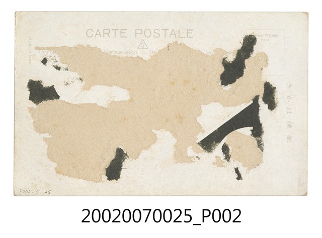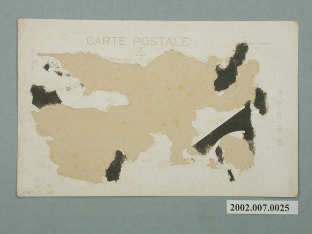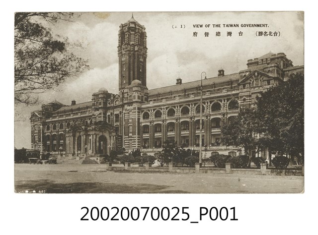 1.本物件為以臺灣總督府為景之明信片。正面為臺灣總督府之黑白照片。明信片中可見台灣總督府高塔與立面,左上方及右方皆有樹。正面右上方載有「(台北名勝)臺灣總督府」、「VIEW OF THE TAIWAN GOVERNMENT.」、「(A1)」字樣,左下方載有(台北山一發行)字樣,為今臺北市博愛特區之中華民國總統府。背面為明信片書寫面,右上方有郵票黏貼處,印有「Place Postage Here」字樣,右側有以漢字、平假名書寫之「郵便はがき」,正上方印有「CARTE POSTALE」字樣。2.臺灣總督府設立於西元1895年,為日本殖民政府在臺灣的最高統治機關,圖中所見的臺灣總督府廳舍啟用於西元1919年,目前為中華民國總督府並為文化部所指定的國定古蹟。臺灣總督府由長野宇平治、森山松之助設計,於大正8年(1919)落成,主體平面呈「日」字形,為五層樓建築物,立面充滿文藝復興時期特色。