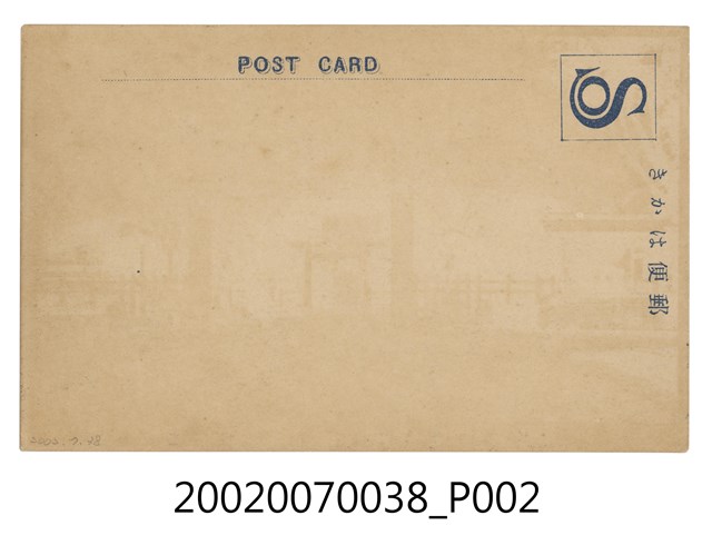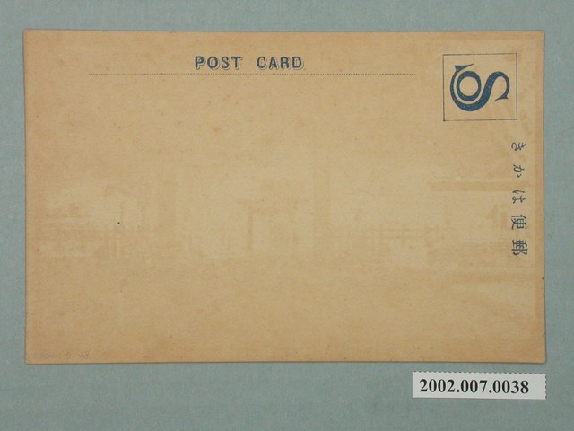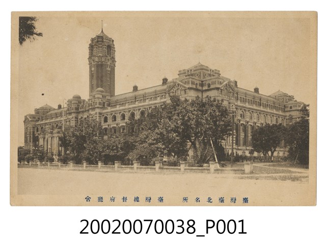 1.本物件為以臺灣總督府為景之明信片。正面為臺灣總督府之黑白照片。大致可見總督府高塔及右側立面。正面下方有大量樹木及馬路,明信片下方載有「臺灣臺北名所 臺灣總督府廳舍」之字樣。背面為明信片書寫面,右上方有郵票黏貼處,黏貼處框框內印有「S」字樣,右側有以漢字、平假名書寫之「郵便はがき」,正上方印有「POST CARD」之字樣。2.臺灣總督府設立於西元1895年,為日本殖民政府在臺灣的最高統治機關,圖中所見的臺灣總督府廳舍啟用於西元1919年,目前為中華民國總督府並為文化部所指定的國定古蹟。臺灣總督府由長野宇平治、森山松之助設計,於大正8年(1919)落成,主體平面呈「日」字形,為五層樓建築物,立面充滿文藝復興時期特色。