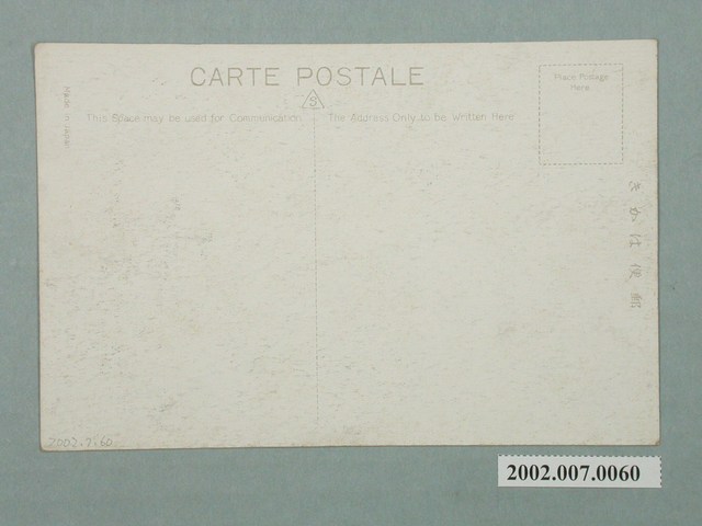 1.本物件為以臺灣步兵第一聯隊酒保與下士集會所為景之明信片。正面下士集會所外關之黑白照片。明信片可見一棟兩層樓的建築物,建築物牆壁上方有一個星星圖案,外面種有幾顆樹幹很細的樹木及其他植物。正面左下方印有「三大隊下士集会所(酒保)」。日文「酒保」指的是在軍隊、兵營中販售日用品、飲料食物的商店。該照片原址現為臺北市中正區之中正紀念堂東側。背面為明信片書寫面,右上方有郵票黏貼處,印有「Place Postage Here」字樣,右側有以漢字、平假名書寫之「郵便はがき」,正上方印有「CARTE POSTALE」、中間有一條分隔線,線左邊標有「This space may be used for Communication」、「Made in Japan」,線的右邊標有「The Address Only to be Written Here」之字樣。2.日治時期的臺灣軍制經過多次改變,臺灣步兵第一聯隊係根據西元1907年編制,臺灣步兵第一聯隊之駐紮地為今中正紀念堂的位置,相對於北部,另設臺灣步兵第二聯隊,駐紮地為今國立成功大學。