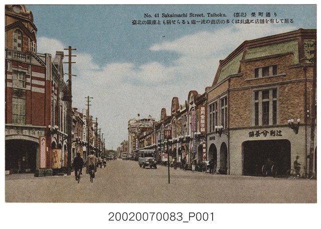 1.本物件為以臺北榮町通り為景之明信片。正面為臺北榮町街街景之彩色照片。明信片左右兩側皆為建築,建築前皆種有一排電線桿、行人、汽車、人力車及騎腳踏車的人。照片右邊第一間商店為辻利茶舖,其隔壁那間有紅色招牌,以白色寫著「風月堂菓子舖」。明信片正面上方載有「No.41 Sakaimachi Street, Taihoku.」、「(臺北)榮町通り」、「臺北の銀座とも稱せらる、處一流の商店の多くは此處に店舖を有して居る」之字樣(大意:臺北榮町又稱為臺北的銀座,此處有相當多的一流商店)。背面為明信片書寫面,右上方有郵票黏貼處,明信片右側有以漢字、平假名書寫之「郵便はがき」,正上方印有「POST CARD」,正中央印有「(臺北 生蕃屋本店 印行)」之字樣。2.該明信片地點為現今臺北市中正區衡陽路及重慶南路一帶,其中辻利茶舖為今星巴克重慶門市。