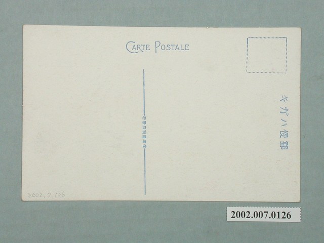 1.本物件為以臺北新公園博物館為景之明信片。正面為臺北新公園博物館之彩色圖畫,依照片角度看應是面對建築物所繪之圖畫。圖畫中可見台北新公園博物館前方及周圍有草皮及樹木。明信片正面右上方印有「(台北)新公園(博物館ト檳榔樹林)」、「158. THE TAIHOKU NEW PARK. (THE MUSIUM AND BETEL-NUT TREES)」之字樣。該照片地點為今臺北市中正區之二二八和平紀念公園內。背面為明信片書寫面,右上方有郵票黏貼處,右邊有以漢字、片假名書寫之「郵便ハガキ」,正上方印有「CARTE POSTALE」之字樣,中間印有「生蕃屋商店發行」之字樣。2.日治時期位於臺北新公園的博物館為今國立臺灣博物館,成立於西元1908年為臺灣最早的博物館,日治時期時全稱為臺灣總督府博物館,西元1913年當時的民政長官祝辰巳發起募款活動欲興建故兒玉總督暨後藤民政長官紀念館,西元1915年正式完工啟用,主要的陳列品分為地質鑛物、植物、動物、人類器用、歷史及教育資料、農業材料、林業資料、水產物、鑛業資料、工藝品、貿易類等項目,主要蒐藏為自然史標本。