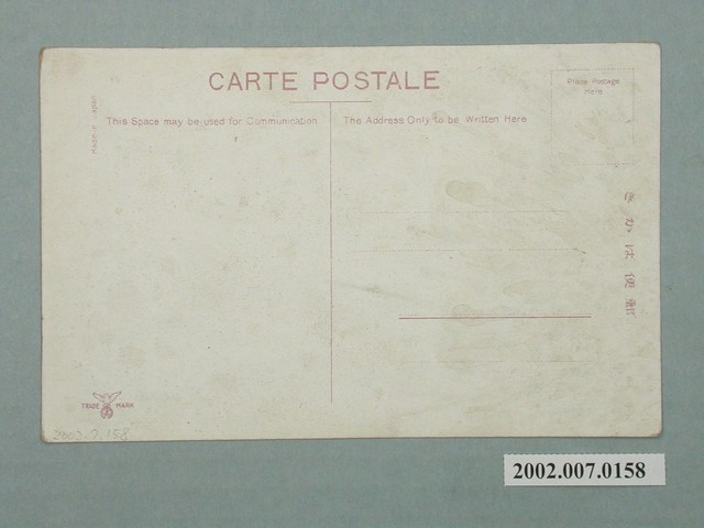 1.本物件為以臺中行啓紀念館為景之明信片。正面為臺中行啓紀念館之黑白照片。明信片可見行啓紀念館為兩層樓高之建築,建築兩側皆植有路樹,道路上可看見兩個騎腳踏車的騎士。明信片正面左上方載有「THE MAGNIFICENT HALL BUILT IN MEMORY A VISIT OF THE CROWN PRINCE.」、「(臺中)壯麗善美盡建築行啓紀念館」、「今上陸下攝政宮殿下に在せし時御渡臺、臺中に行啓遊されしを記念せんために建てられし大建築にして島內物產を一字に集めたり」之字樣,大意:為紀念攝政公陛下來臺行啟時於臺中所建造的一大建築,建築內集有島內的相關物產。背面為明信片書寫面,右上方有郵票黏貼處,印有「Taisho Hato Brand」字樣,右側有以漢字、平假名書寫之「郵便はがき」,正上方印有「CARTE POSTALE」、中間有一條分隔線,線左邊標有「This space may be used for Communication」、「Made in Wakayama」,線的右邊標有「The Address Only to be Written Here」之字樣。左下方有老鷹註冊商標。2.臺中行啟紀念館是為了紀念東宮行啟而設立,西元1925年4月舉行地鎮祭並開工,最後於1926年完工,當時的經費總額為7萬日圓,其中3萬5千為臺中州下官民募資而來,剩下的則由臺中州補助,主要陳列臺中州內教育、產業相關的物品與物產。