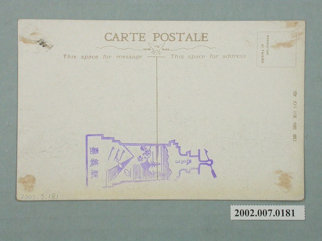 1.本物件為以嘉義北白川宮能久親王殿下御遺跡地為景之明信片。正面為嘉義北白川宮能久親王殿下御遺跡地之黑白照片,最左側另有一張北回歸線碑的照片。照片可見石製矮圍牆,中央為推門,內部種了許多樹,樹的中央聳立著一個石柱。明信片的右側,在圍牆外的地方可看見一個石碑上載有「北白川宮能久親王殿下御遺跡 嘉義御舍營所址」之字樣。明信片左側則有一張直式照片,被裁切成橢圓形形狀,照片為北回歸線標碑之照片,並載有「北回歸線」之字樣。明信片正面上方載有「(臺灣嘉義)北白川宮能久親王殿下御遺跡地」之字樣。背面為明信片書寫面,右上方有郵票黏貼處,黏貼處上載有「MANUFACTURED, BY TAISHO」之字樣。右側有以漢字、平假名書寫之「郵便はがき」,正上方印有「CARTE POSTALE」、老鷹註冊商標,商標左邊標有「This space for message 」、商標右邊標有「This space for address 」之字樣。下方蓋有紫色印章,為嘉義車站的紀念印章,外框為北回歸線標碑之形狀,內部刻有山與樹木的形狀,上下各載有日期「15.8.3」與「嘉義駅」之字樣。2.北白川宮能久親王是日本伏見宮邦加親王之九子,曾遠赴普魯士留學,並任中將近衛師團長,並曾參與甲午戰爭,臺灣民主國成立後,北白川宮能久親王率軍參與乙未戰爭,攻入臺南後不久即染上臺灣風土病最後病逝於東京自宅,臺灣民間流傳許多不同版本的死亡傳說,而日人則將它神格化,故臺灣有多處神設奉祀北白川宮能久親王,如臺灣神社。