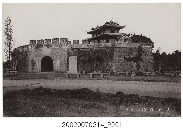 1.本物件為以臺南大南門為景之明信片。正面為臺南大南門之黑白照片。照片可見臺南大南門,臺南大南門周圍有大石碑、城牆及閣樓,前有道路、長椅、樹木、草皮。明信片左下方印有「大南門(臺南) Y257」之字樣。背面為明信片書寫面,右上方有郵票黏貼處,右側有以漢字、平假名書寫之「郵便はがき」,上方印有「UINIONPOSTALE UNIVERSELLE CARTE POSTALE」之字樣,中央有一條分隔線。2.大南門古稱寧南門,為清領時期所留下來之遺跡,甕城型結構,利於防禦。建於西元1725年,1736年改為磚石建造,為當時府城重要城門之一。現位於臺南市中西區南門公園內,為直轄市定古蹟,目前的樣貌為1977年根據原樣重建的結果。