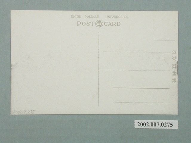 1.本物件為以高雄州廳為景之明信片。該明信片為黑白照片。照片可見一棟兩層樓的建築,其一旁有規劃一區植物區,正面前方也種有植物,其餘地方皆為道路。可看見道路上有一輛車及兩個人。照片左下方載有「(臺灣高雄)高雄州廳」、「The Takao provincial government」之字樣。背面為明信片書寫面,右上方有郵票黏貼處,黏貼處印有高雄市徽。右側有以漢字、平假名書寫之「郵便はがき」,正上方印有「UNION POSTALE」、「POST CARD」之字樣。2. 西元1920年高雄州正式被設立,其管轄範圍為今高雄市、屏東縣、澎湖縣,直至1945年統轄有二市、七郡,圖中的高雄州廳廳舍建於1931年,目前位於高雄市前金區,為日本時代的行政中心。