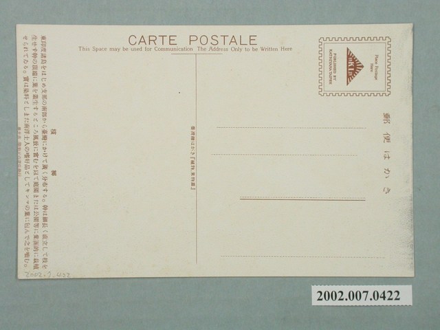 1.本物件以臺灣植物為主題,彩色樣式。正面為民宅周圍植有檳榔樹之圖像,圖像右側之民宅為傳統閩式建築,門口貼有春聯,門前有整齊堆好的石堆。圖像左側為各式粗細不一的樹枝堆。背面右上角為郵票黏貼處,該處有以英文字母標誌「Place Postage Here」、「PUBLISHED BY KATSUYAMA TAIPEH」,中間有一個三角圖形內有太陽升起的圖案。右側有以漢字、平假名書寫之「郵便はがき」,上方以英文字母書寫「CARTE POSTALE」、「This Space may be used for Communication」、「The Address Only to be wtitten Here」。左側以漢字與日文書寫「東印度諸島をはじめ支那の南部から臺灣にかけて広く分布する。幹は細長く直立して枝を生ぜず幹の頂端に葉を叢生するところ風致に富むを以て庭園または公園等に集團的に栽植せられてゐる。實は染料としまた南洋土人の嗜好品としてキンマの葉に包んで之を啮む。」大意是:檳榔廣泛分布於印度東部群島、中國南部、臺灣,臺灣多集中種植於花園、公園,樹幹長而直立,樹葉密集,果實經常以葉包裹食用,為原住民所嗜。以漢字標示「臺北菊元百貨店發行」。中間以漢字與日文標示「臺灣繪はがき『植物,果物篇』」。2.日治時期文獻多提到臺灣人嚼食檳榔的習俗,且視為臺人惡習,故初期曾禁止臺灣人種植與嚼食檳榔。中後期,檳榔儼然成為東臺灣「殖民地景」,與棕櫚樹同樣列入移民村的作物栽培建議。後期則轉為輔導檳榔園轉作其他水果。
